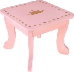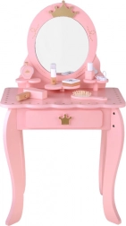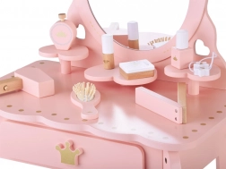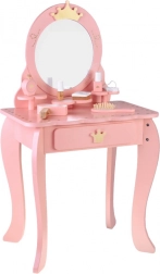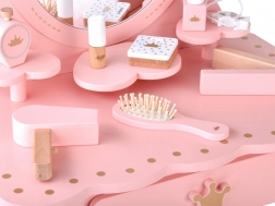 Ružičasta drvena toaletna stolić za male princeze sa zlatnim krunicama i sigurnim ogledalom pretvara svaku dječju sobu u čarobno kraljevstvo. U kompletu su stoličica, praktična ladica za blaga i bogat set frizerskih i kozmetičkih dodataka za kreativnu igru stilistice.