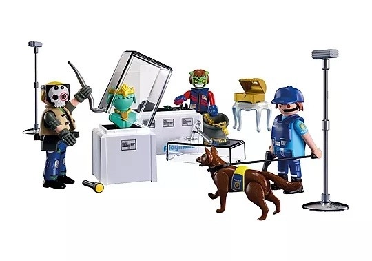 U muzeju se oglasio alarm – lopovi pokušavaju obiti vitrine i pobjeći s plijenom! Policajac se tiho šulja izložbenom dvoranom i zajedno sa službenim psom započinje potjeru. Set PLAYMOBIL Action Heroes donosi dinamičnu priču s mnogo realističnih dodataka i funkcija koje djecu uvlače u svijet velikih pljački.