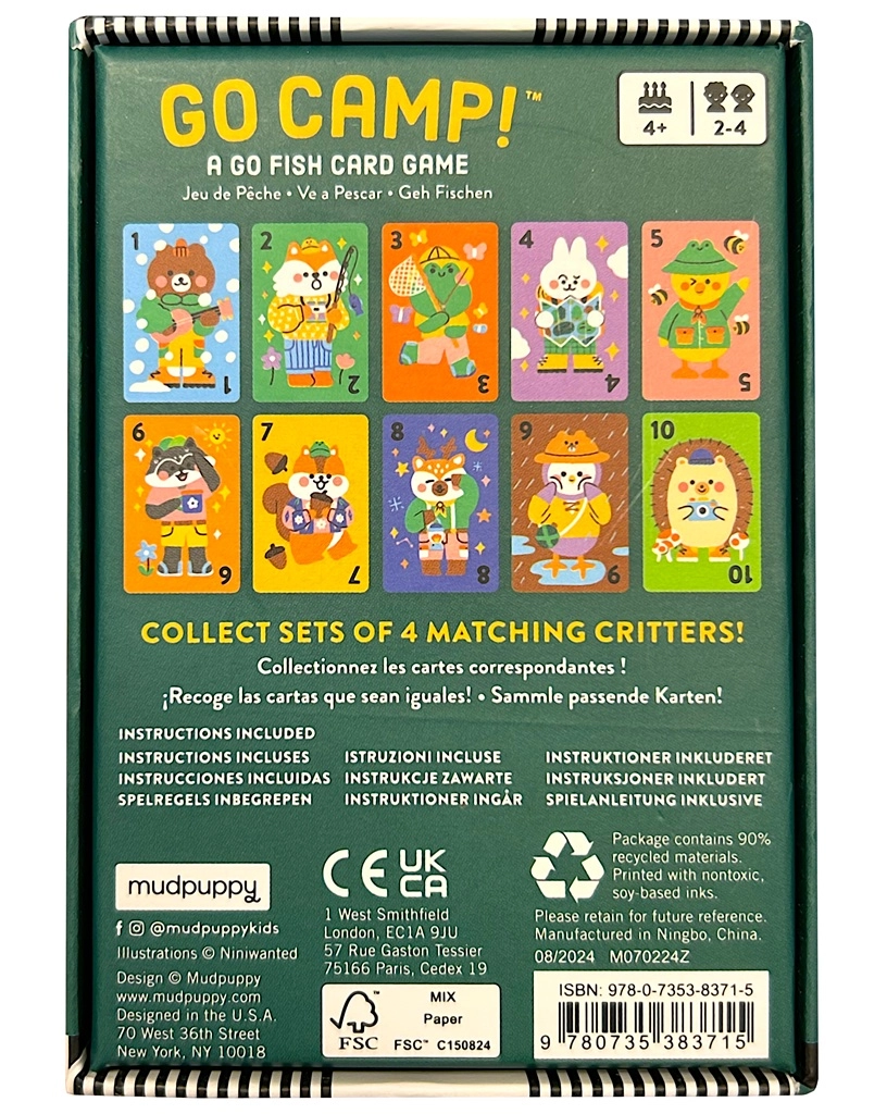 Otkrijte zabavu na temu kampiranja s kartaškom igrom Mudpuppy Idemo kampirati. Zahvaljujući jednostavnim pravilima i lijepim ilustracijama uživat će u njoj i djeca i odrasli. Igra je kompaktna, pa je savršena za ruksak na izlete i za kišne dane kod kuće.