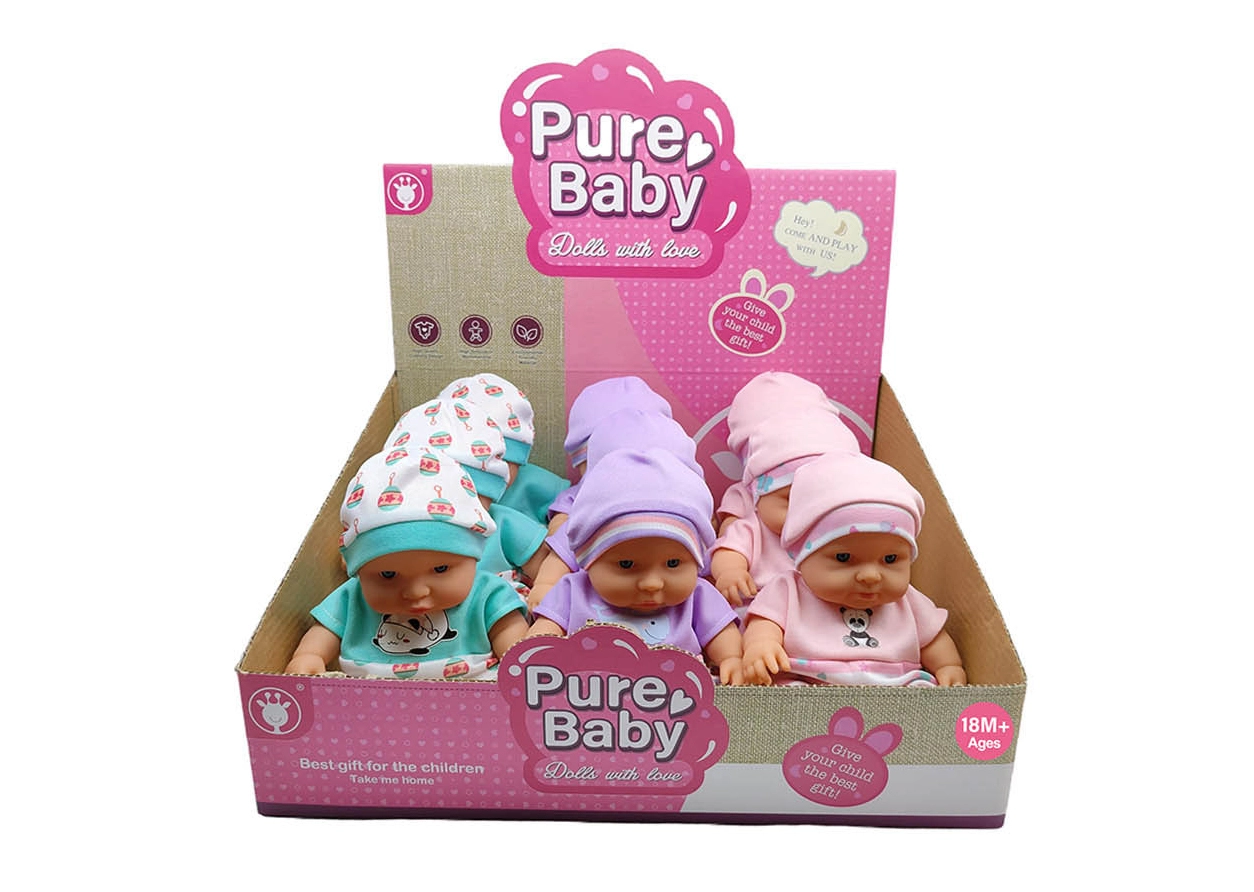 Slatka bebica visine 20 cm razveselit će svako dijete. Dostupne su 3 varijante boja – ružičasta, ljubičasta i plava. Idealna za igru mame i bebe, razvoj fine motorike i mašte. Izloženo u display boxu po 9 komada – odlično i kao poklon.