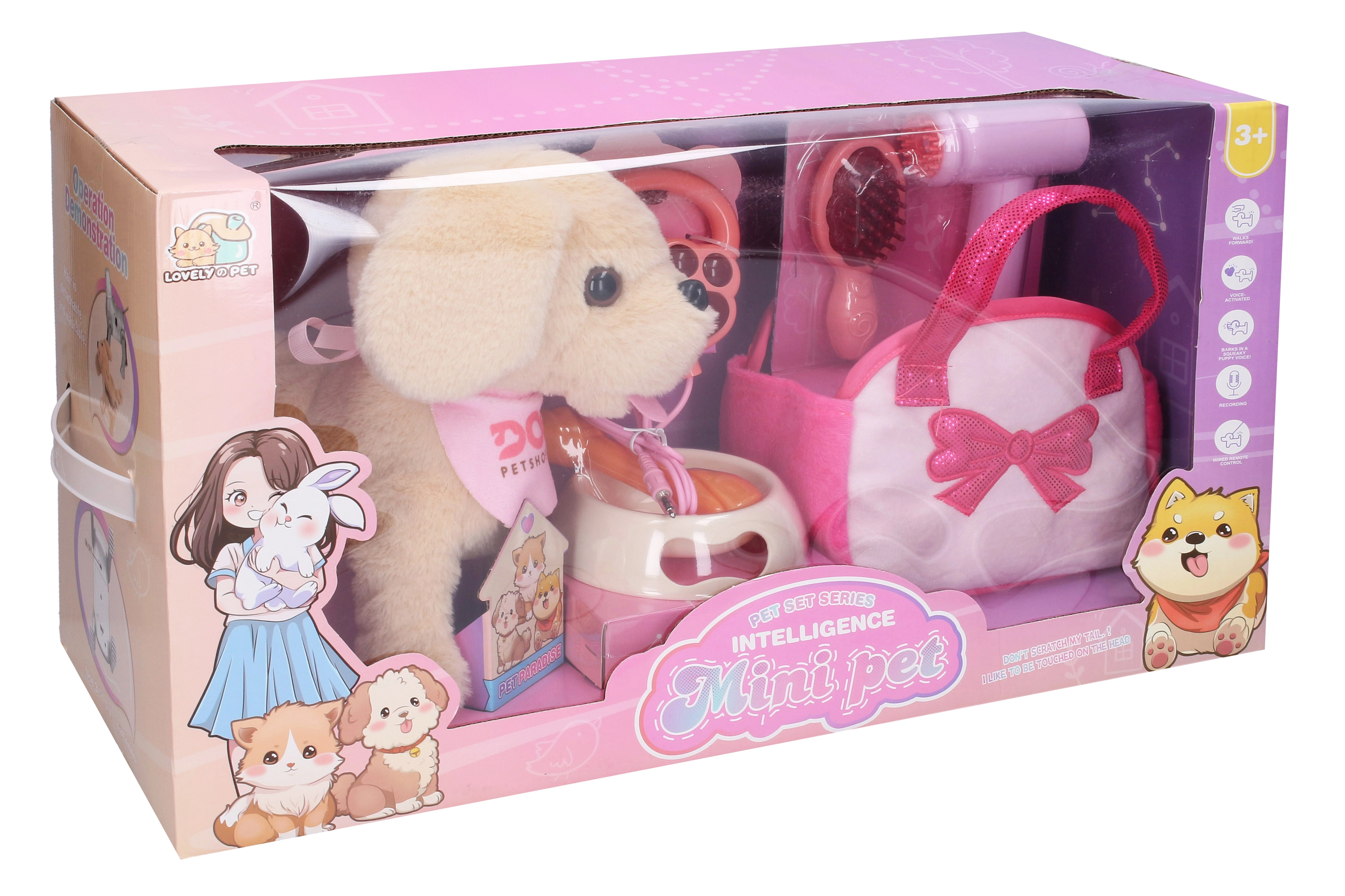 Preslatki interaktivni plišani pas donosi djeci sate zabave zahvaljujući pametnim funkcijama i jednostavnom upravljanju. Reagira na dodir i pljesak, zna se šetati na povodcu, lajati, mahati repom i reproducirati glazbu. Set dodatno sadrži zdjelicu, kost, četku, sušilo za kosu i torbu za potpunu brigu o ljubimcu. Idealan poklon za male ljubitelje životinja.