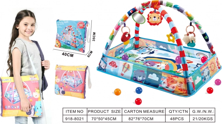 Univerzalna podloga za igru za bebe od prvih dana života nudi sigurno okruženje za igru i razvoj osjetila. Ima žive boje, čvrstu i stabilnu konstrukciju te se može koristiti kao ležaljka, ogradica i suhi bazenčić. U kompletu su odvojive viseće igračke i nekoliko mekih loptica. Jednostavna je za održavanje i dolazi u praktičnoj torbi preko ramena.