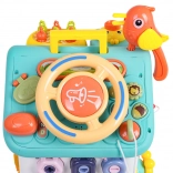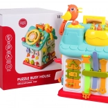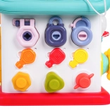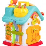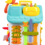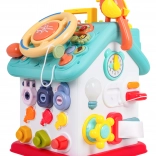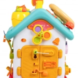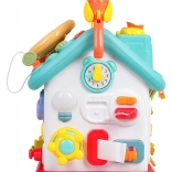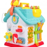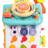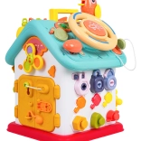 Ova šarena interaktivna kućica nudi mnoštvo aktivnosti na svim stranama i na krovu: osvijetljen volan s trubom, žmigavcima i starterom s ključem, set brava i ključeva za sparivanje, sat s pomičnim kazaljkama, prekidače, prijenose i druge manipulativne elemente. Djeca vježbaju koordinaciju oko–ruka i razumiju princip uzrok–posljedica.