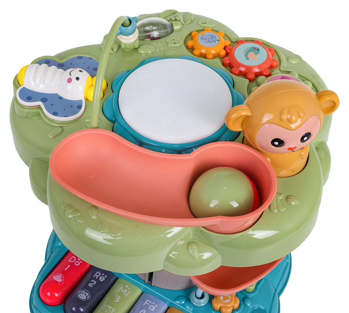 - svjetlosni i zvučni efekti, klavir 4 načina rada, bubanj, melodije, nazivi brojeva i životinja, zupčanici, perlice, zvečka, sparivanje oblika, spiralni tobogan za loptice