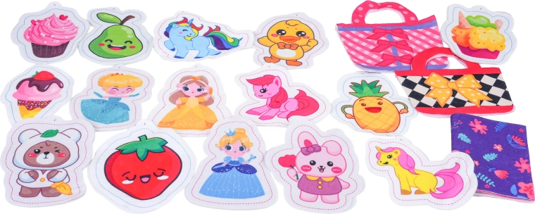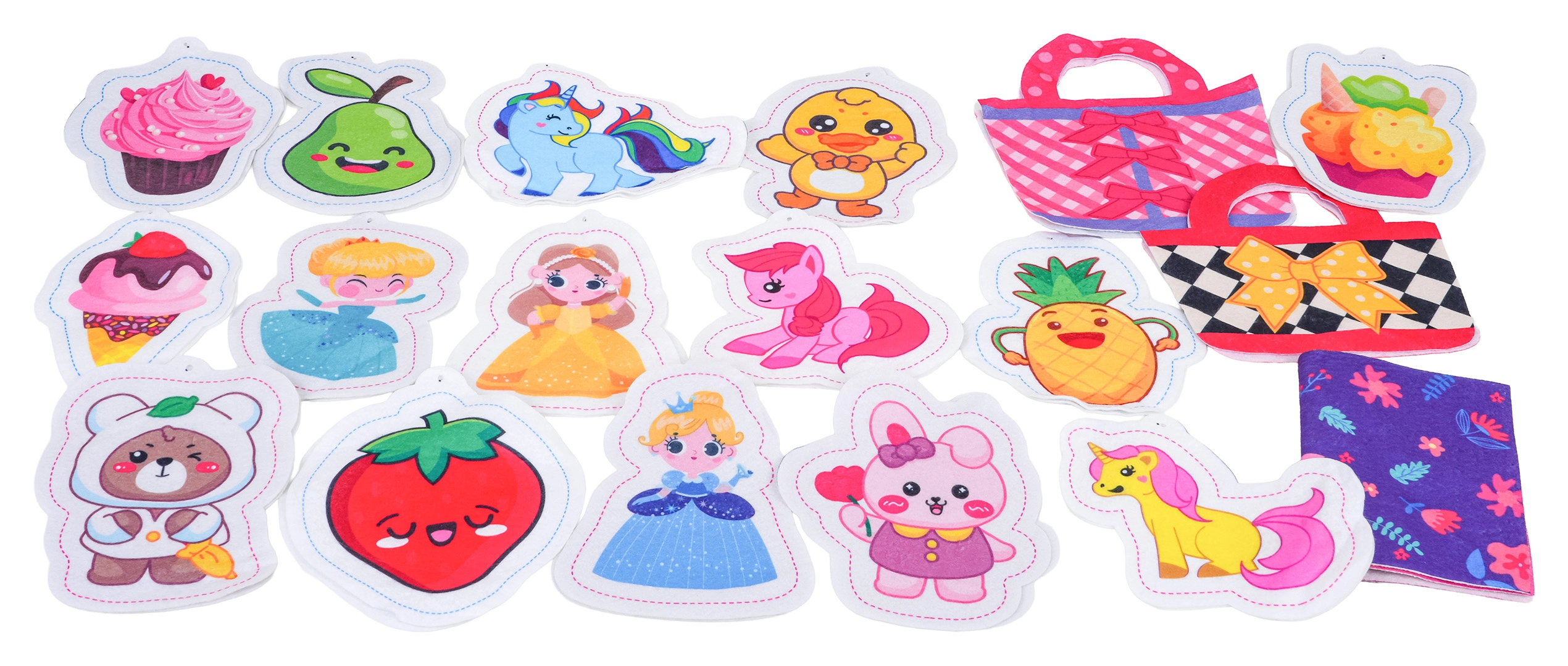 Set uključuje filcane predloške za torbice, tekstilne dijelove, šablone za izradu plišanih ukrasa, ispunu, lančiće s kuglicama i škare – sve što je djeci potrebno za izradu vlastitih dodataka i slatkih privjesaka. Igra potiče koordinacijske vještine, strpljenje i kreativnost.