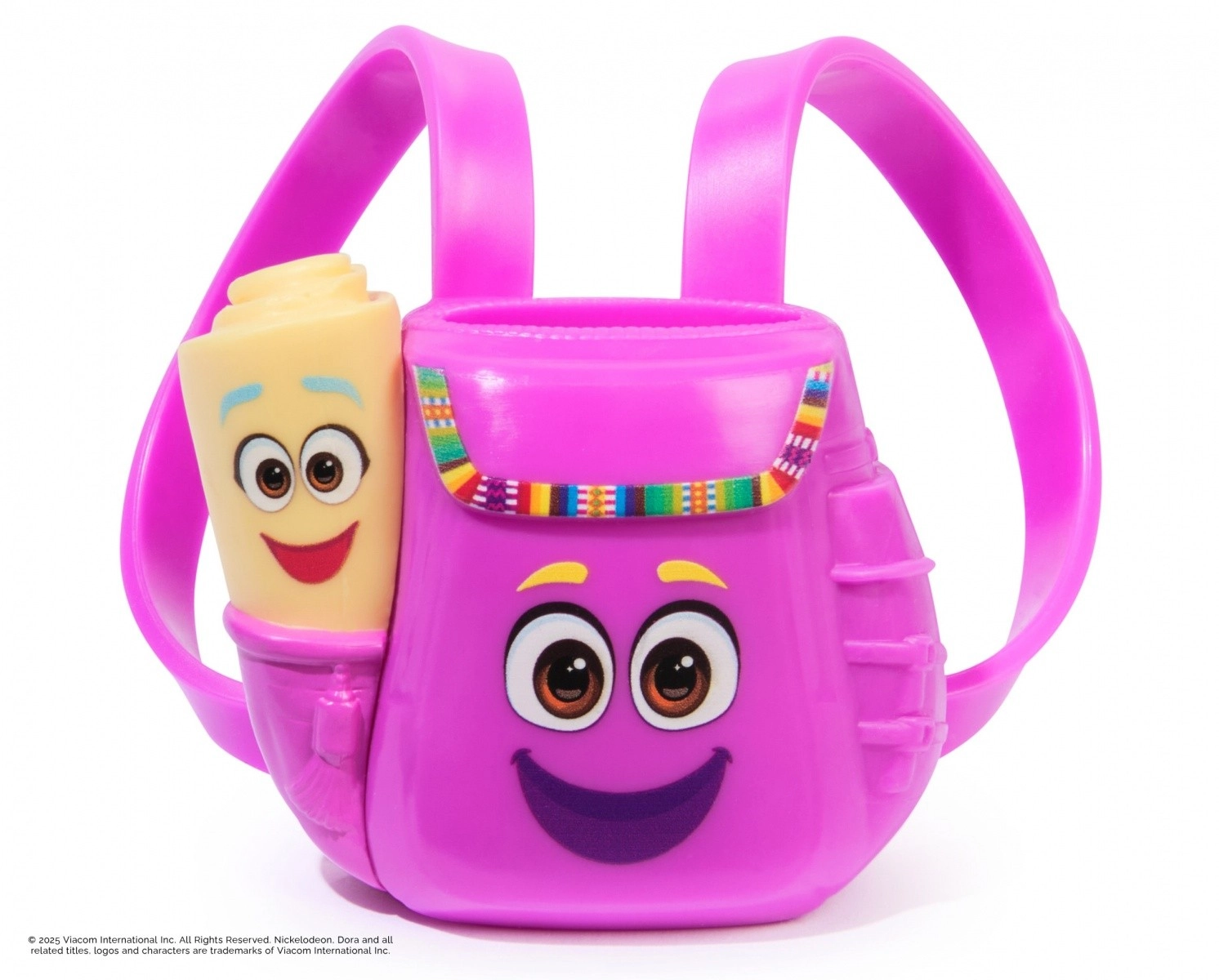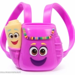 Dio seta je ikonični ljubičasti ruksak s nasmijanim licem – gornji dio se otvara na pritisak, spreman za male dragocjenosti s izleta. Lutka je osmišljena za maštovitu igru, potiče finu motoriku i prirodno učenje riječi.