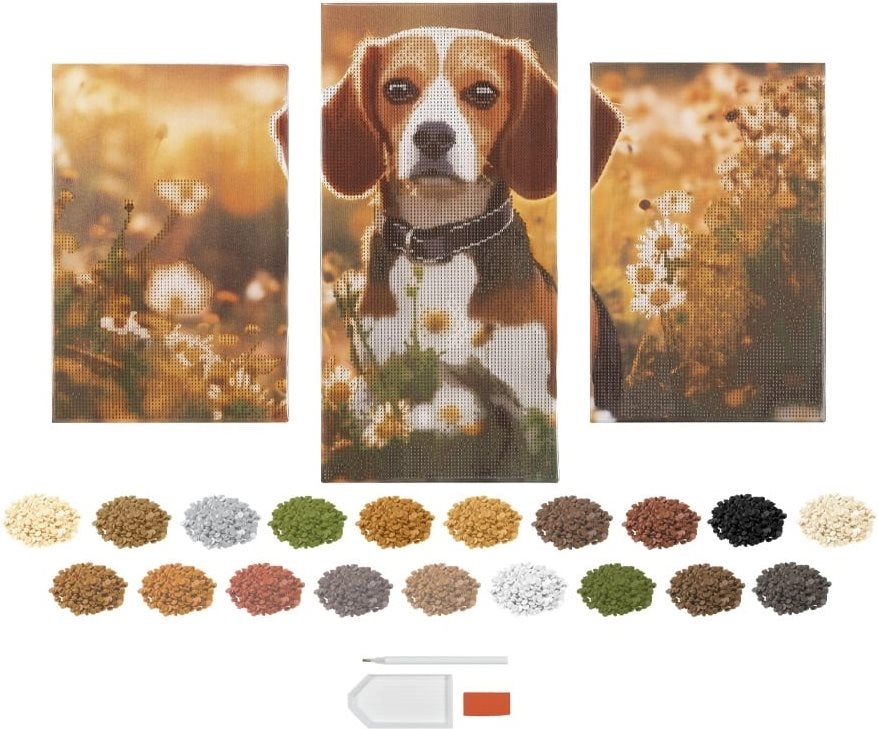 Ovaj kreativni set za dijamantno slikanje sadrži sve potrebno za izradu dojmljivog triptiha s motivom psa. Svako platno ima pretisnuti uzorak s ljepljivim slojem u koji jednostavno postavljaš kamenčiće prema priloženoj legendi. Završna slika prekrasno svjetluca i istaknut će se u dnevnoj sobi, spavaćoj sobi ili dječjoj sobi.