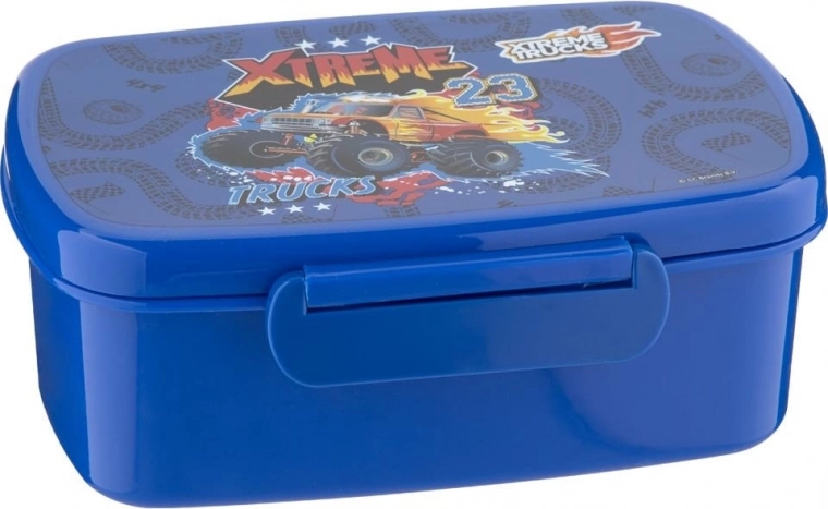 Praktična dječja kutija za užinu s motivom XTREME TRUCKS brenda HOME UNIVERSE. Zahvaljujući izdržljivom materijalu podnosi svakodnevnu upotrebu, štiti hranu i sitnice, a zbog atraktivne dekoracije na poklopcu djeca će je rado nositi u školu, na igralište i na izlete.