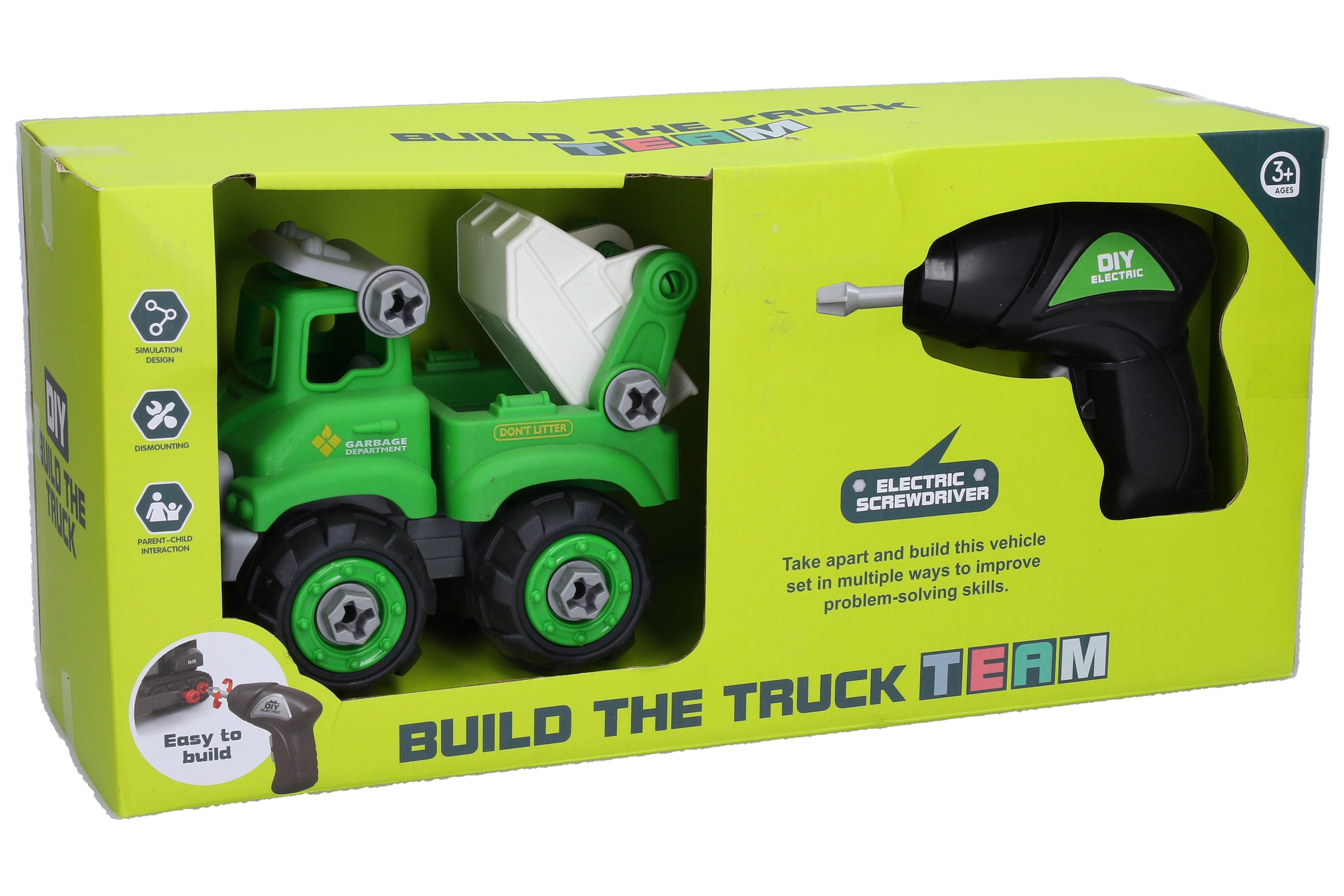 Zabavna konstrukcijska igračka za male tehničare: vijčani kamion za smeće dužine 17 cm s električnim odvijačem i ručnim alatom. Djeca vozilo sama rastavljaju i sastavljaju, čime razvijaju finu motoriku, logičko razmišljanje i strpljenje. Električni odvijač radi na 2× AA baterije (nisu uključene).