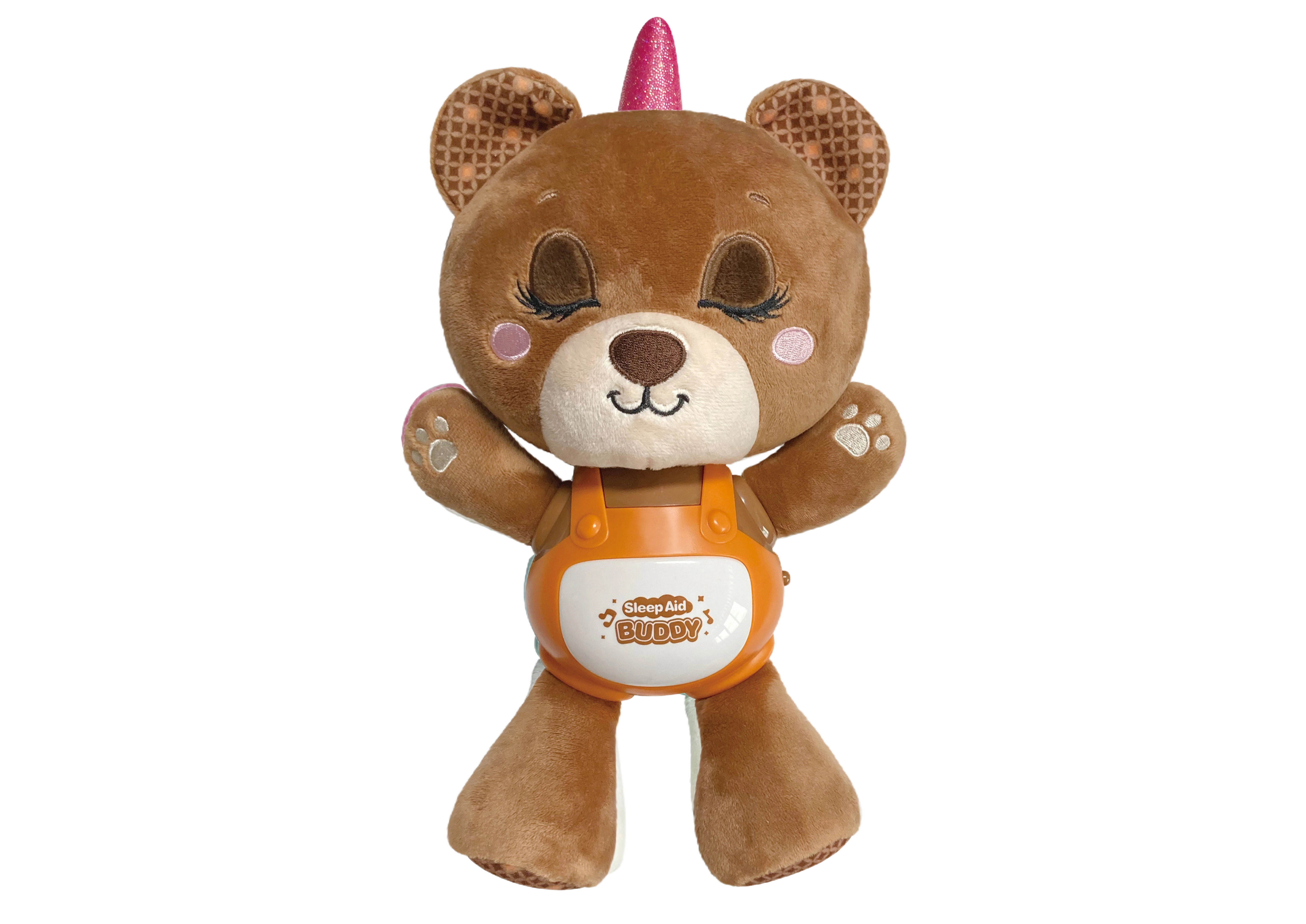 Preslatki medvjedić za uspavljivanje veličine 29 cm pomaže djeci mirno zaspati zahvaljujući kombinaciji uspavanki, umirujuće glazbe, zvuka hrkanja i nježnog noćnog svjetla. Upravlja se jednostavno – dovoljno je pritisnuti trbuščić i prebacivati između režima. Praktični prekidač on/off nalazi se sa strane.