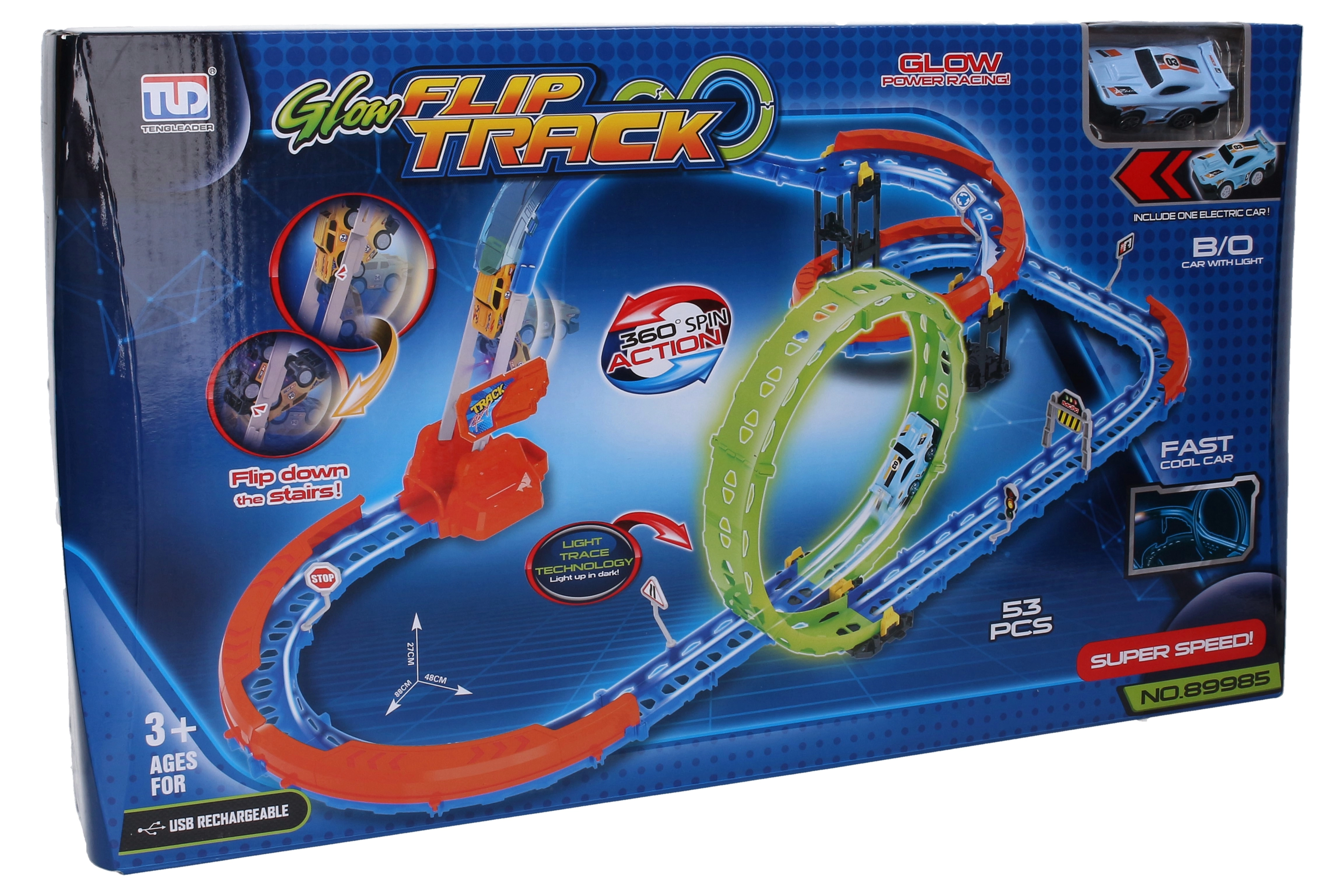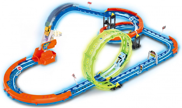 Zabavna staza sa svjetlećim autićem donosi djeci dinamičnu vožnju punu svjetlosnih efekata. Dimenzije sastavljene staze su 88 × 27 × 48 cm, a autić ima ugrađenu litijsku bateriju 3,7 V / 90 mAh s USB punjenjem. Upravljanje je jednostavno zahvaljujući ON/OFF prekidaču i priključku za punjenje na donjoj strani vozila.