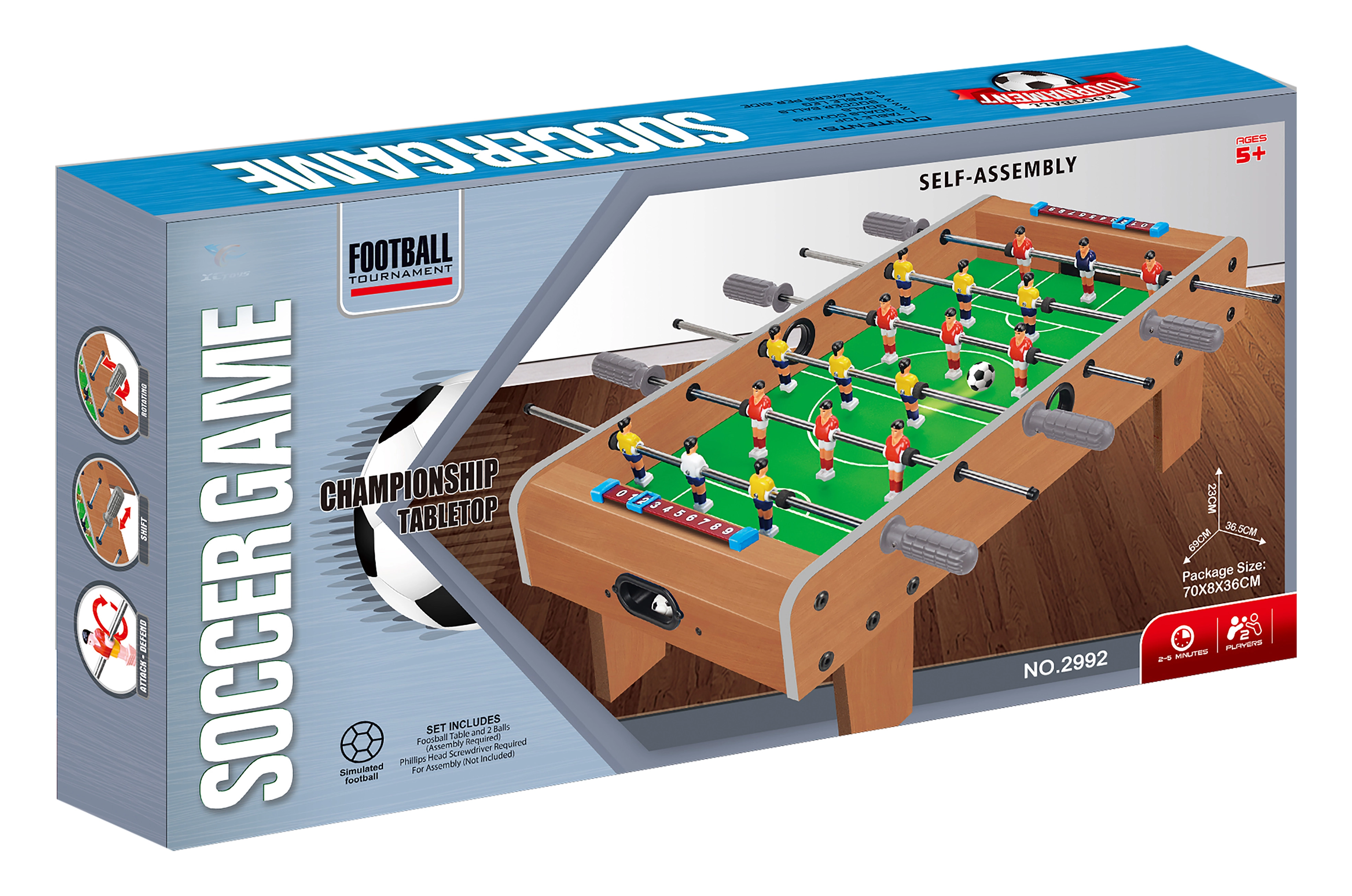 Uživajte u napetim dvobojima kod kuće s kompaktnim stolnim nogometom dimenzija 69 × 36,5 × 23 cm. Idealan za obitelji i prijatelje, nudi brzu zabavu i jednostavno sastavljanje. U pakiranju ćete pronaći stol i 2 loptice. Sastavljanje je jednostavno, dovoljan je križni odvijač (nije uključen u pakiranje).