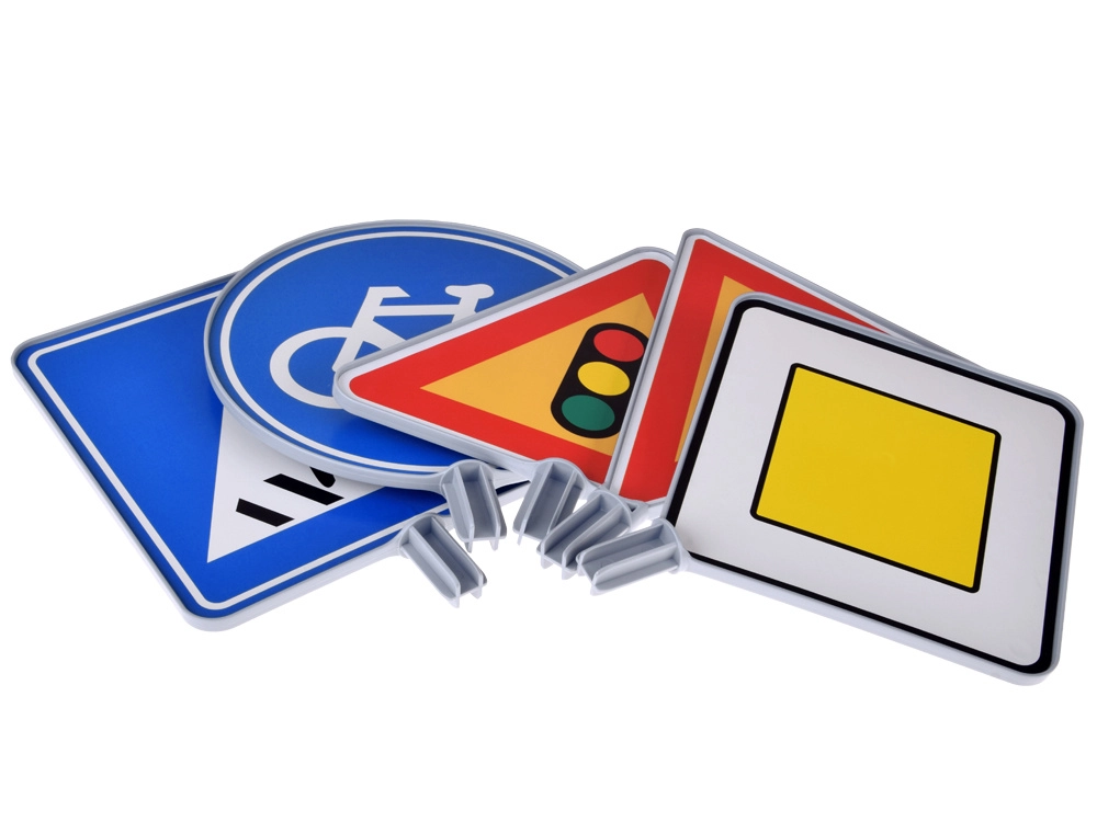 Svaki znak se sastoji od postolja, cijevi i spojnica koje se brzo i jednostavno montiraju. Postolja se mogu napuniti vodom ili pijeskom za maksimalnu stabilnost. Lagana, ali izdržljiva plastika sigurna je za djecu, a šarene naljepnice izvrsno su čitljive.