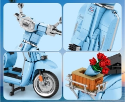 Komplet je promišljeno podijeljen u vrećice i dopunjen naljepnicama s detaljima, pa je slaganje pregledno i zabavno. Nakon dovršetka modela cijenit ćete čvrstu konstrukciju, funkcionalno postolje i autentične proporcije legendarnog skutera.