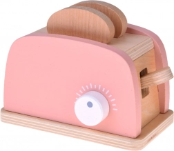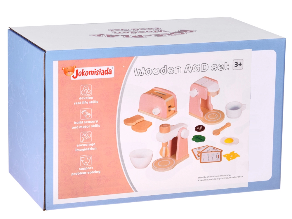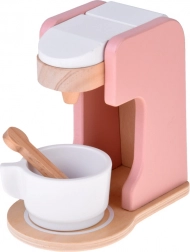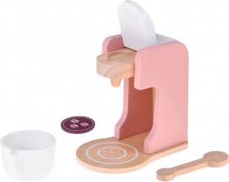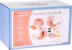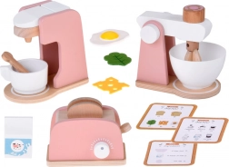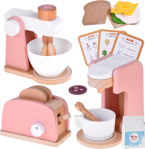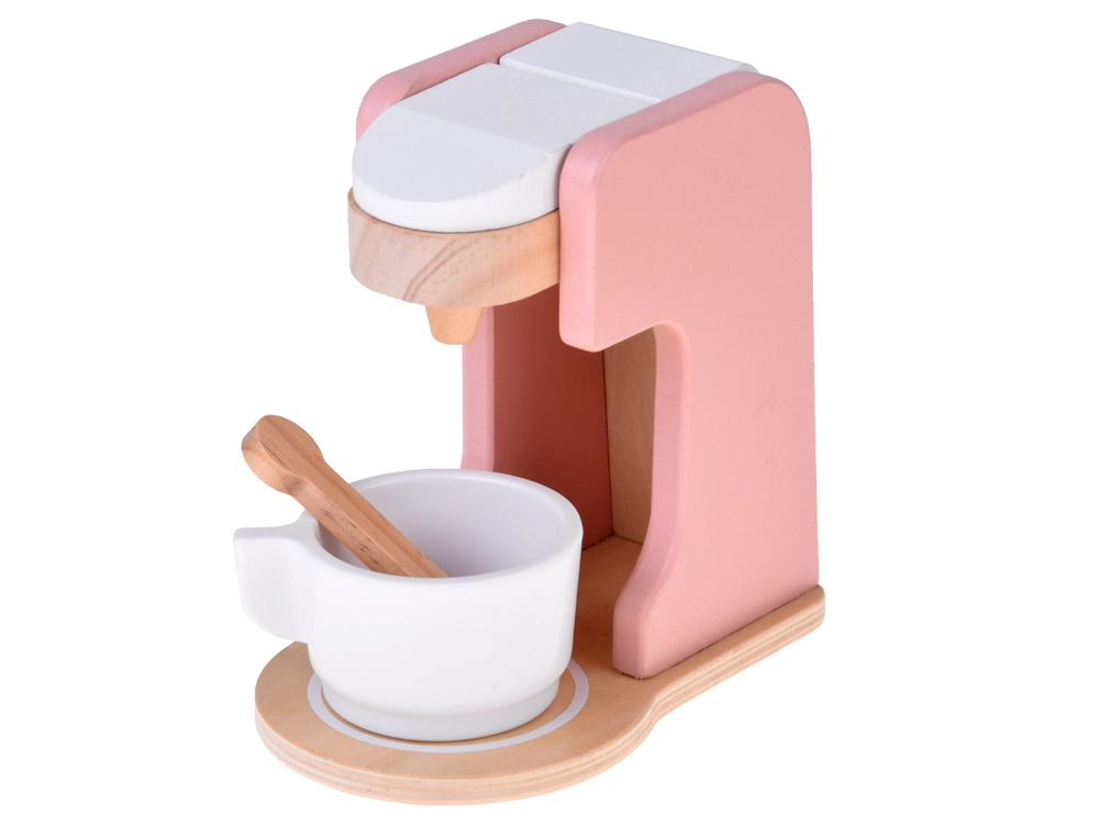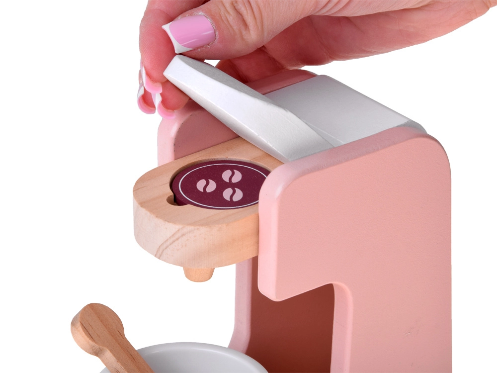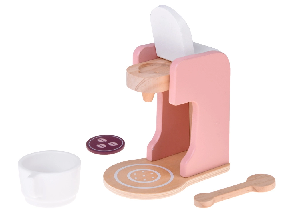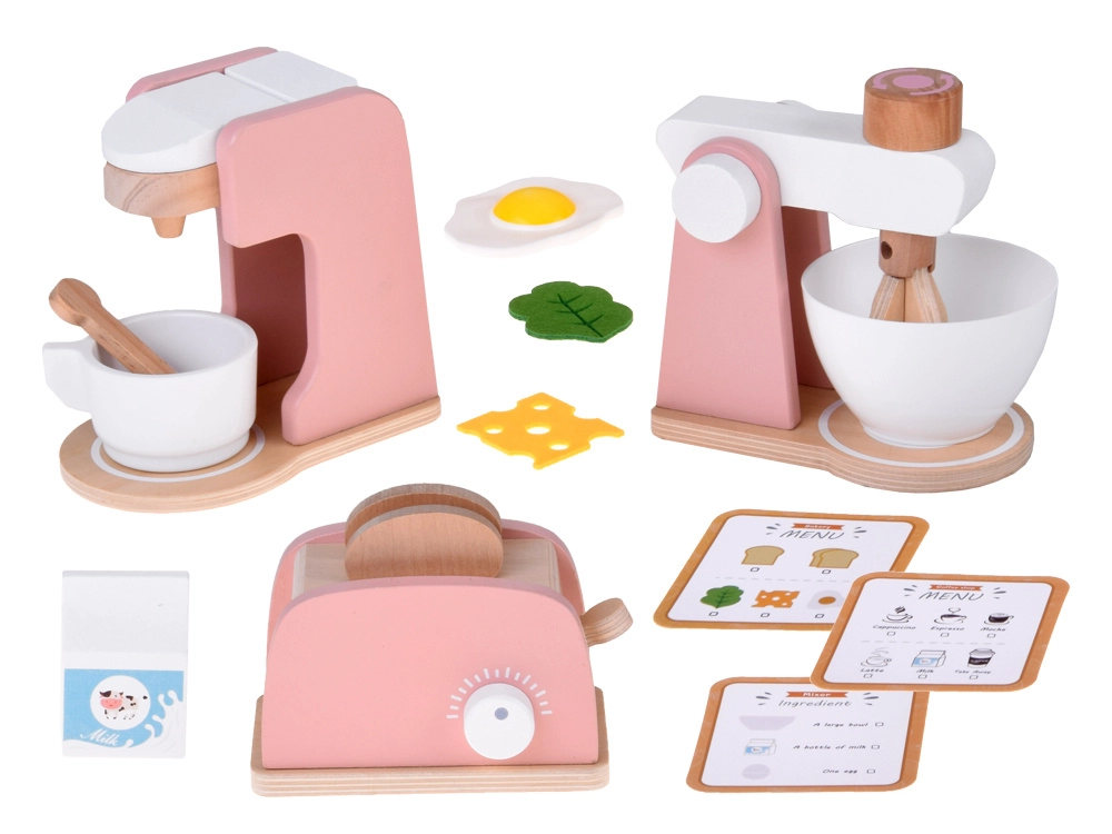 Stilski drveni set malih kućanskih aparata prenosi dječju kuhinju u svijet mašte. Sadrži toster s polugom i okretnim gumbom, aparat za kavu sa šalicom, žličicom i kapsulom te stolni mikser s posudom i rotirajućim pjenjačom. Kvalitetno prirodno drvo, netoksične boje i pastelni dizajn osiguravaju sigurnu i lijepu igru koja razvija finu motoriku, kreativnost i igru uloga.