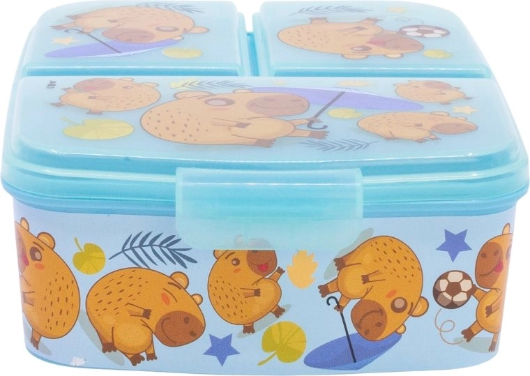 Praktična i stilska kutija za užinu s motivom kapibare za djecu u školu, na igralište i na izlete. Nudi 3 odvojena pretinca, izrađena je od izdržljivog materijala, bez BPA i ima atraktivan dekor na poklopcu.
