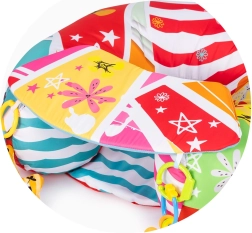 Zahvaljujući mekoj i stabilnoj ispuni pruža sigurnu potporu, dok šareni uzorci i interaktivni elementi pomažu razvijati osjete i koordinaciju oko–ruka. Praktičan materijal lako se čisti, pa je spreman za svakodnevne avanture.