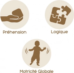 Djeca će obožavati živopisne elemente: labirint s perlicama, okretne nazubljene kotačiće, kugličnu kulu i umetaljku oblika. Svaka aktivnost dizajnirana je tako da potiče motorički razvoj, strpljenje i razumijevanje uzroka i posljedice.