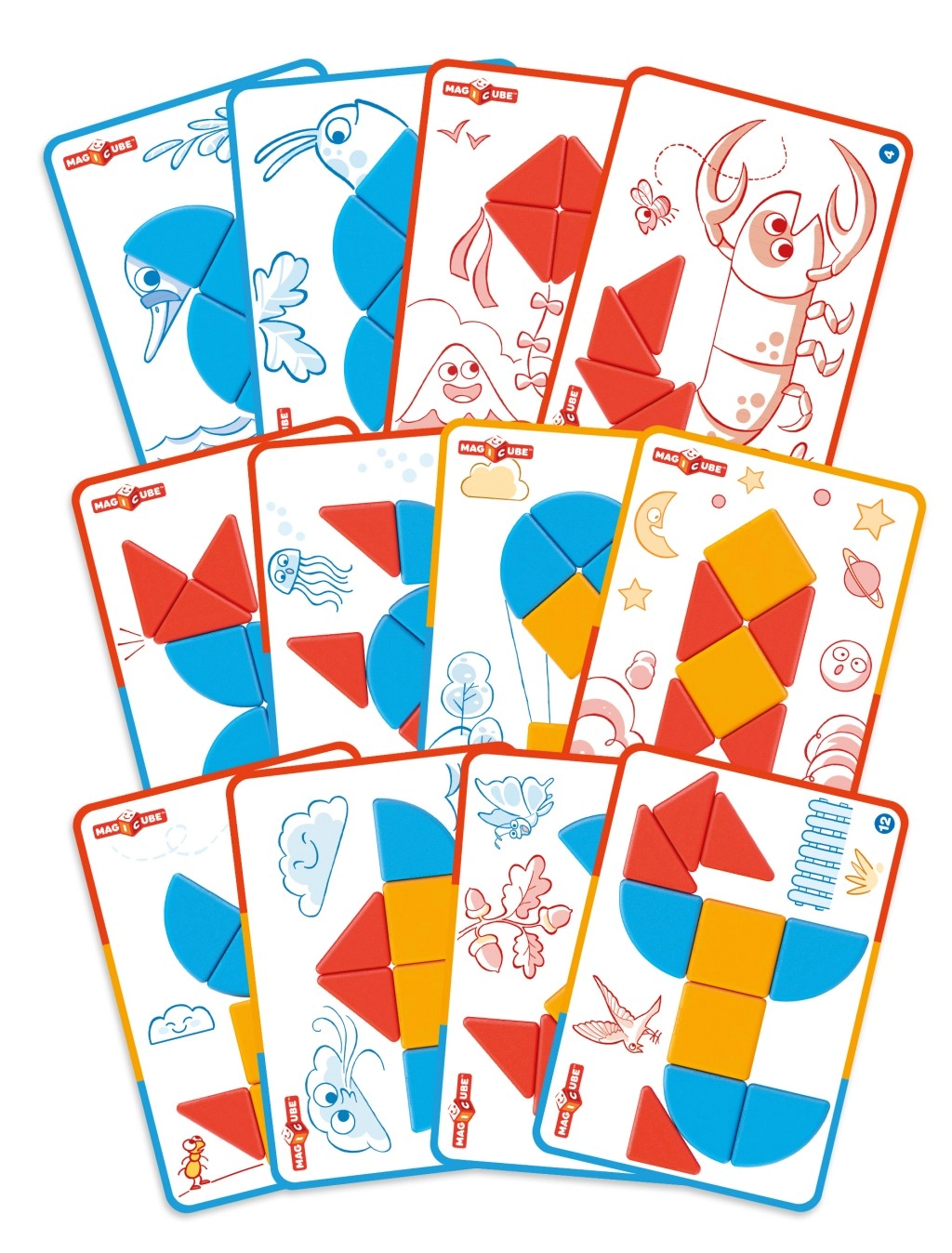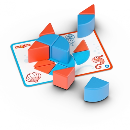 Otkrijte razigranu magnetsku građevnu igru GEOMAG MAGICUBE za najmlađe s ukupno 16 dijelova. 10 magnetskih elemenata i 6 dvostranih kartica s 12 predložaka pomažu djeci lako slagati slike od jednostavnijih do složenijih. Predlošci su u mjerilu 1:1 za udobno slaganje izravno na kartu. Izrađeno od 100% reciklirane plastike, prikladno za djecu od 2 godine i izvrsno razvija maštu i kreativnost.