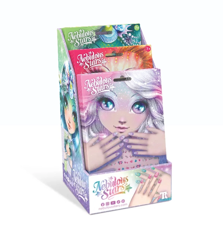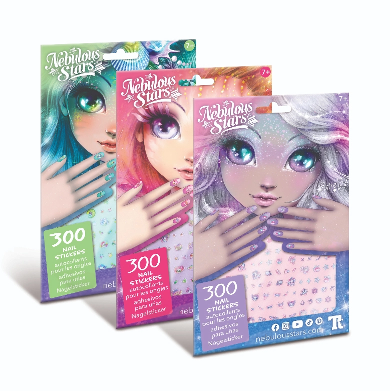 Otkrijte čaroliju manikure bez laka s kolekcijom Nebulous Stars! Ovaj zabavni set nudi 300 naljepnica u 3 čarobna dizajna nadahnutih likovima ESTRELIA, PETULIA i MARINIA. Naljepnice se lako apliciraju i skidaju, sigurne su i idealne za djecu od 7 godina – za kreativne i šarene nokte bez nereda.