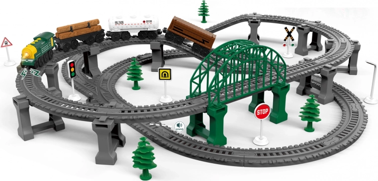 Ovaj željeznički set donosi djeci sate kreativne zabave. Zahvaljujući magnetski spojenim vagonima rukovanje je jednostavno i sigurno. Na lokomotivi se nalaze praktične upravljačke tipke – središnja služi kao ON/OFF, bočnim tipkama određujete smjer vožnje. Poseban dio pruge aktivira zvučne efekte koji vožnji daju autentičnost.