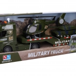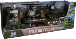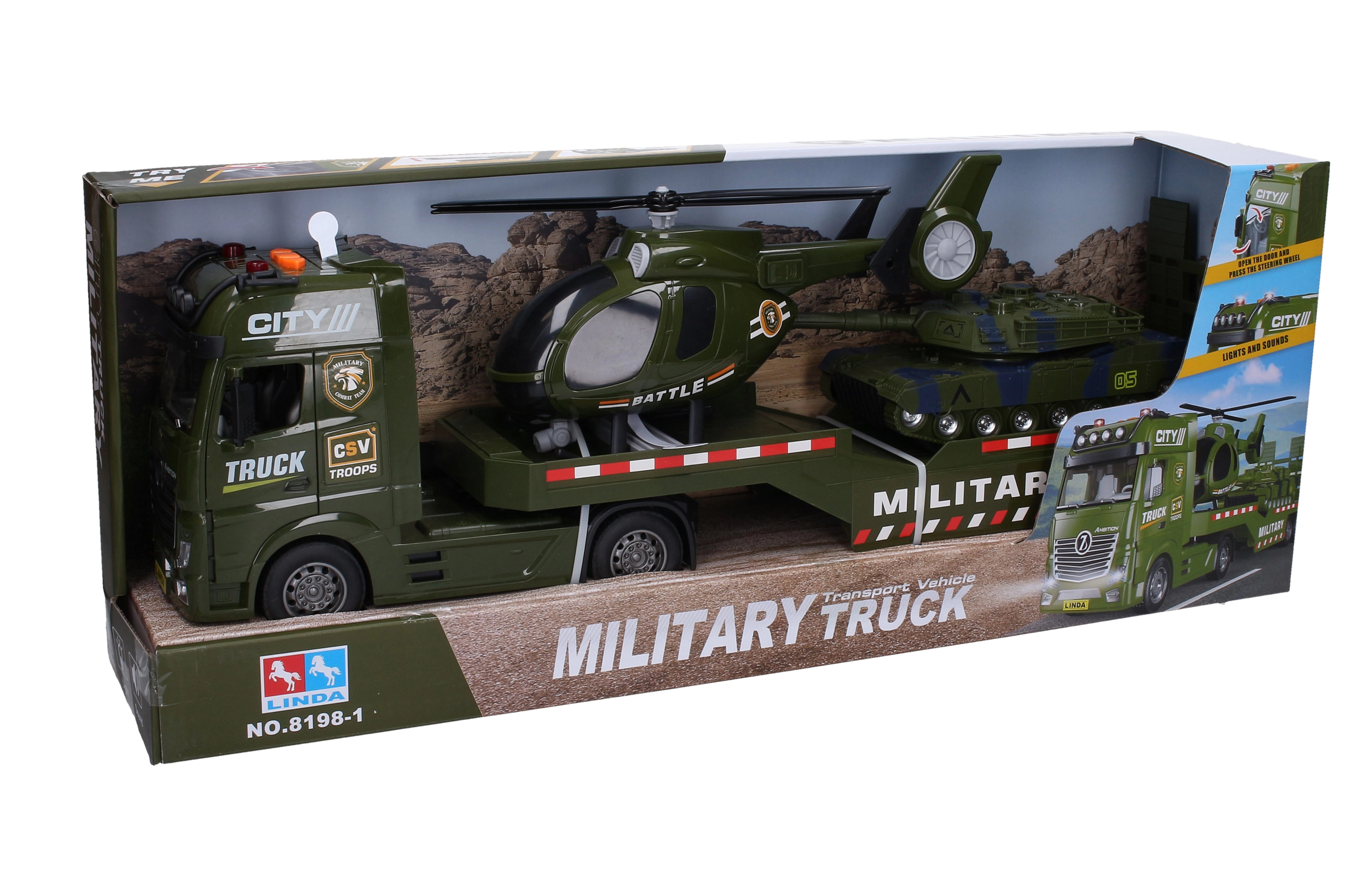 Realističan set za male entuzijaste vojne tehnike: vojni kamion-tegljač 55 cm s helikopterom 27 cm i tenkom 22 cm. Tegljač i helikopter nude svjetlosne i zvučne efekte, aktivirane gumbima, a tegljač vozi na inerciju. Baterije su uključene u pakiranje, pa zabava može početi odmah.