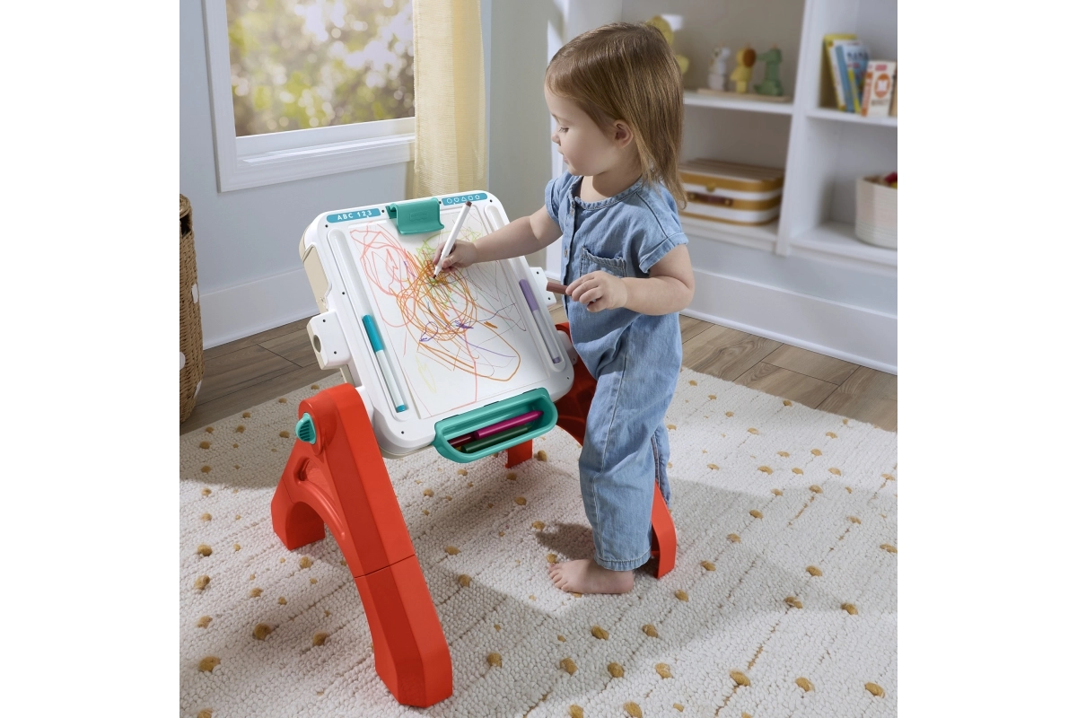 Od sjedenja preko stajanja do samostalnog stvaranja. Stolić lako prebacite u otvoreni stol ili stojeću ploču za male umjetnike.