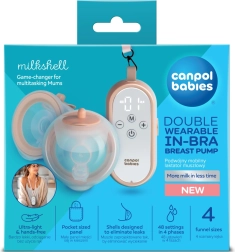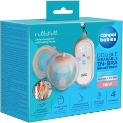 Canpol babies MilkShell moderna je dvostruka bežična izdajalica za grudnjak, dizajnirana za udobno, diskretno i učinkovito izdajanje. Vrlo lagani spremnici (svaki 180 ml) s mekim lijevkom savršeno pristaju u grudnjaku, tako da možete izdajati slobodnih ruku kod kuće i na putu. Upravljačku jedinicu s preglednim tipkama moguće je nositi oko vrata zahvaljujući vrpci – sve je nadohvat ruke i spremno za uporabu.