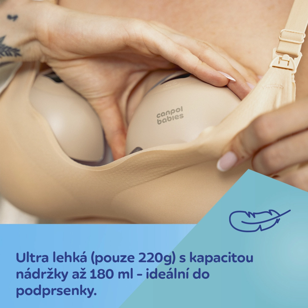 Diskretna i bežična izdajalica za majčino mlijeko za grudnjak CANPOL BABIES SmartSense nudi maksimalnu udobnost i slobodu kretanja za aktivne mame. Zahvaljujući tehnologiji SkinFIT savršeno prianja na dojku bez curenja mlijeka, pruža snažno usisavanje do 36 kPa, 4 načina rada izdajanja s 12 razina, tih rad do 50 dB, ultralaku težinu 220 g i kapacitet 180 ml. Integrirani zaslon, USB‑C punjenje i autonomija do 120 minuta olakšavaju svakodnevnu upotrebu kod kuće, na poslu i na putu.