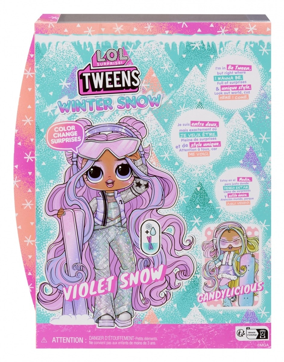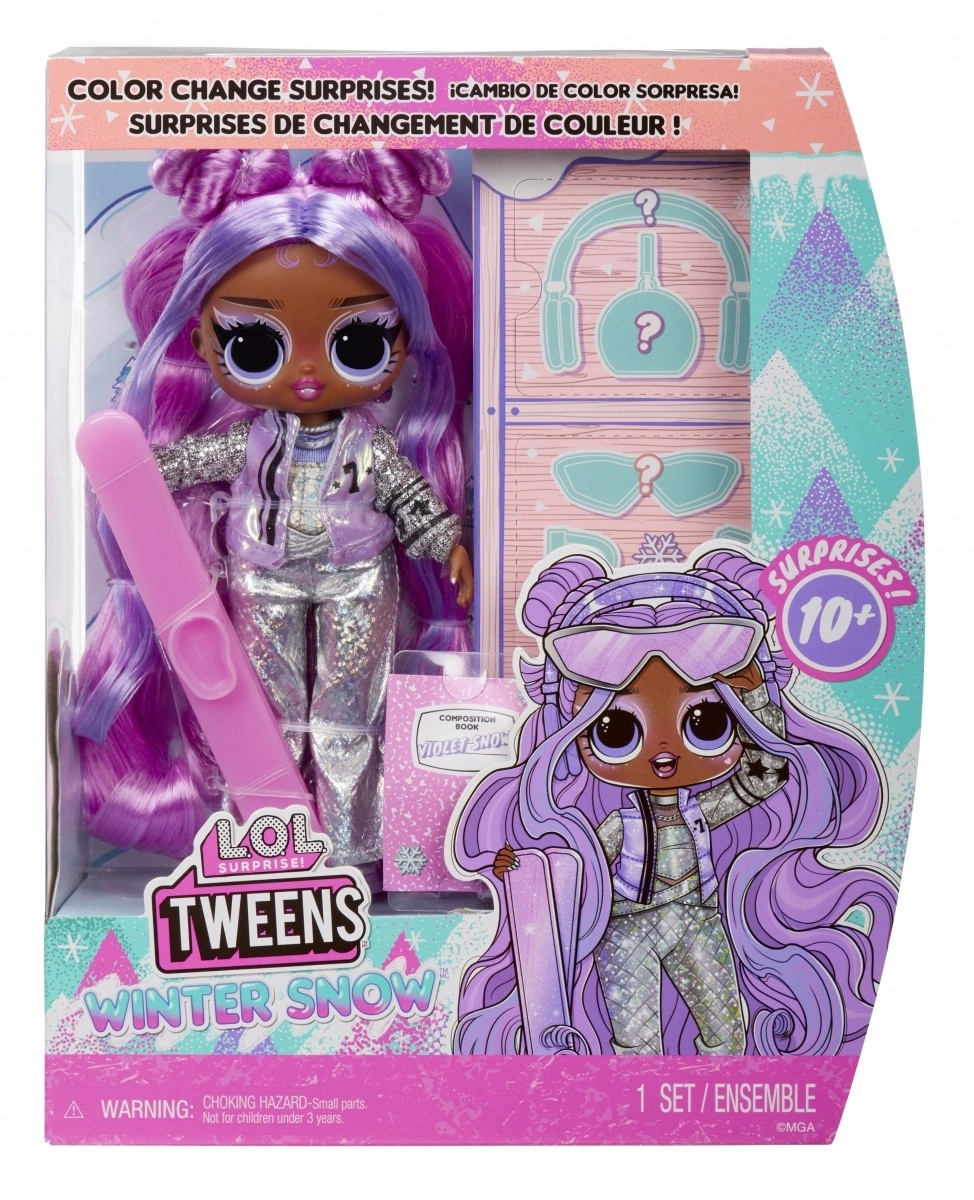 Pripremi se za zimske avanture s lutkom L.O.L. Surprise! Tweens Violet Snow. Trendy odjevne kombinacije, detaljni dodaci i mogućnost poziranja čine svaku igru jedinstvenim doživljajem. Djeca će obožavati stilski usklađene skijaške naočale, slušalice s okretljivim naušnicima i modnu torbicu.