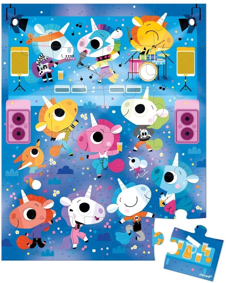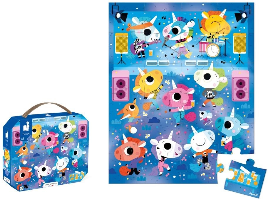 Otkrijte šarmantnu slagalicu u koferiću brenda Janod s temom koncerta jednoroga. Zahvaljujući 24 čvrsta dijela djeca lako slažu veliku sliku dimenzija cca 50 × 40 cm. Praktični kartonski koferić s ručkom idealan je za dom i putovanja te drži sve dijelove na okupu.