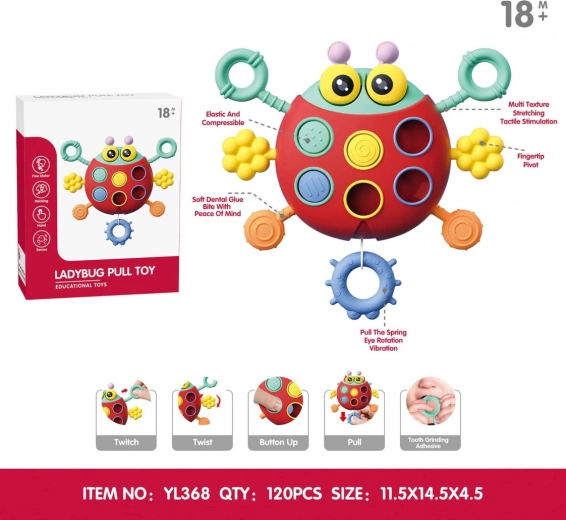 Slatka multifunkcionalna bubamara je osjetilna igračka za djecu od 18 mjeseci. Kombinira žive boje, različite teksture za grickanje i pokretne elemente za povlačenje, pomicanje i okretanje, koji potiču finu motoriku i kognitivne vještine. Nakon zatezanja uzice bubamara zvečki i miče okicama – idealna za kolica, krevetić i auto.