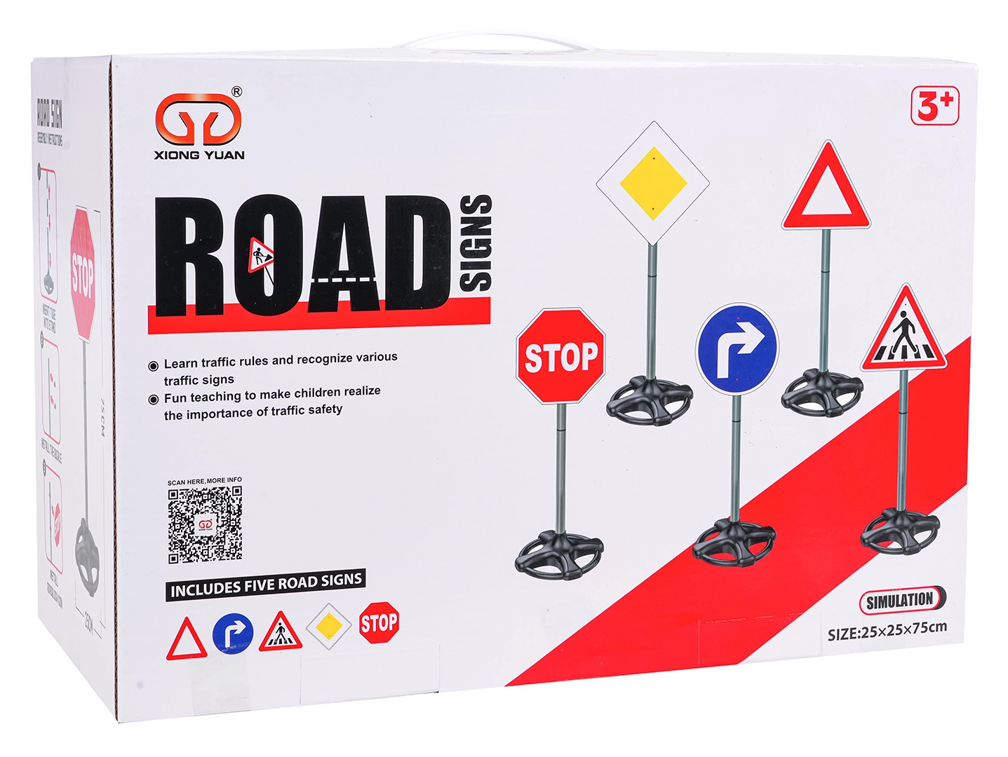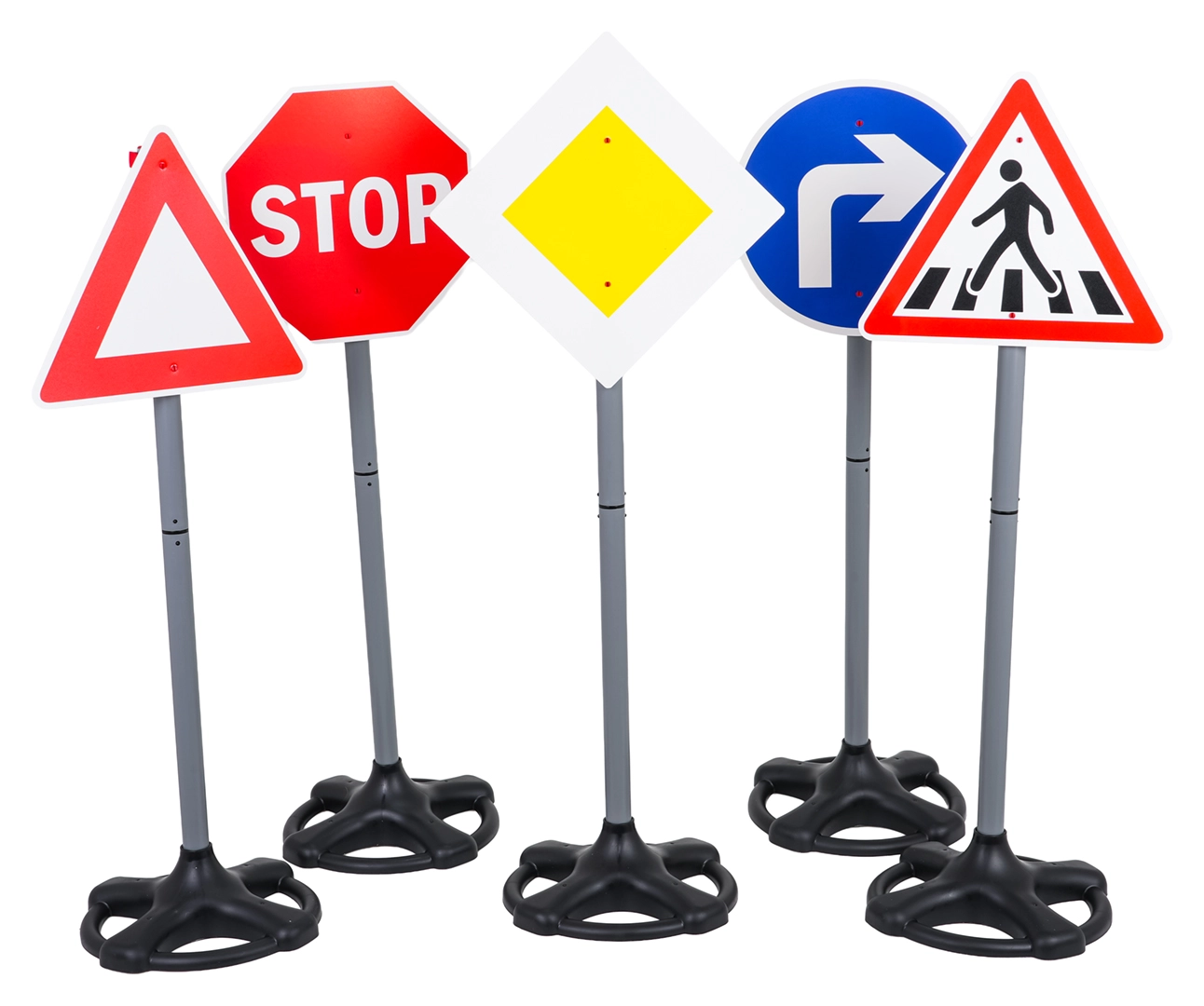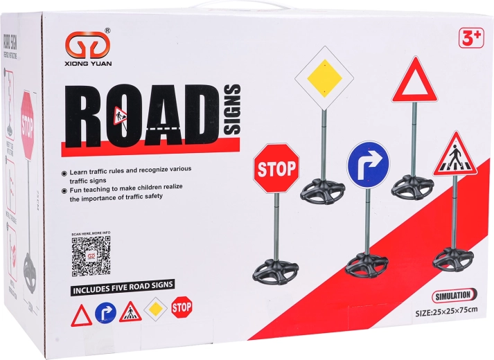 Ovaj mega set sadrži pet realističnih prometnih znakova visine oko 75 cm. Djeca kroz igru uče osnovna pravila sigurnosti i snalaženje u prometu. Robusna, lagana plastična izvedba sa stabilnim, otežanim postoljima osigurava sigurnu upotrebu u interijeru i eksterijeru.