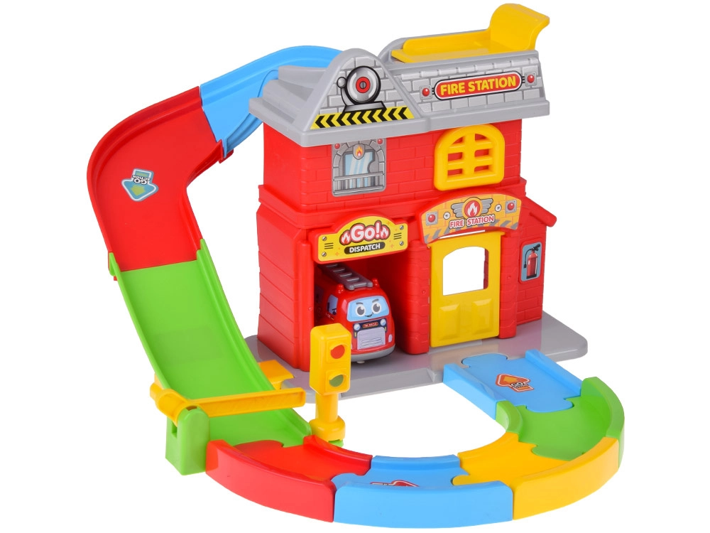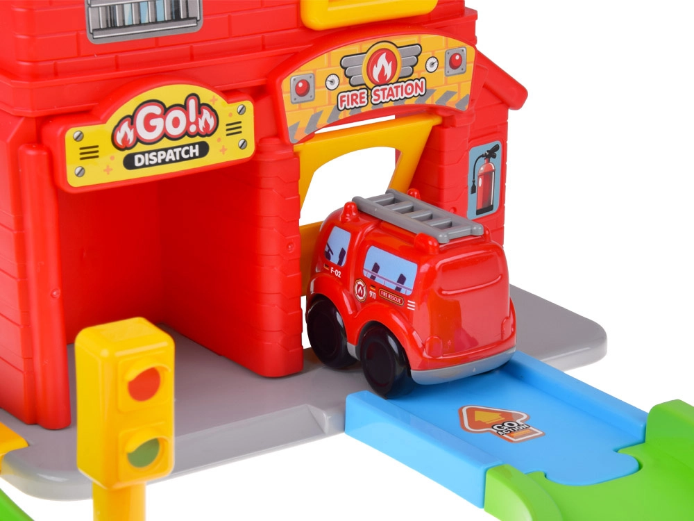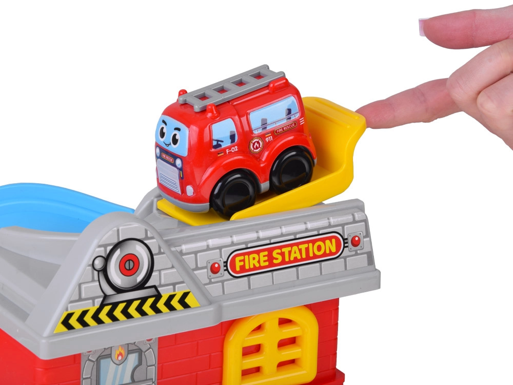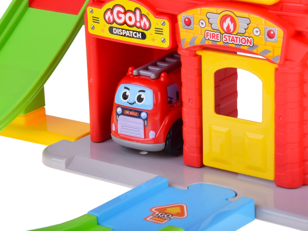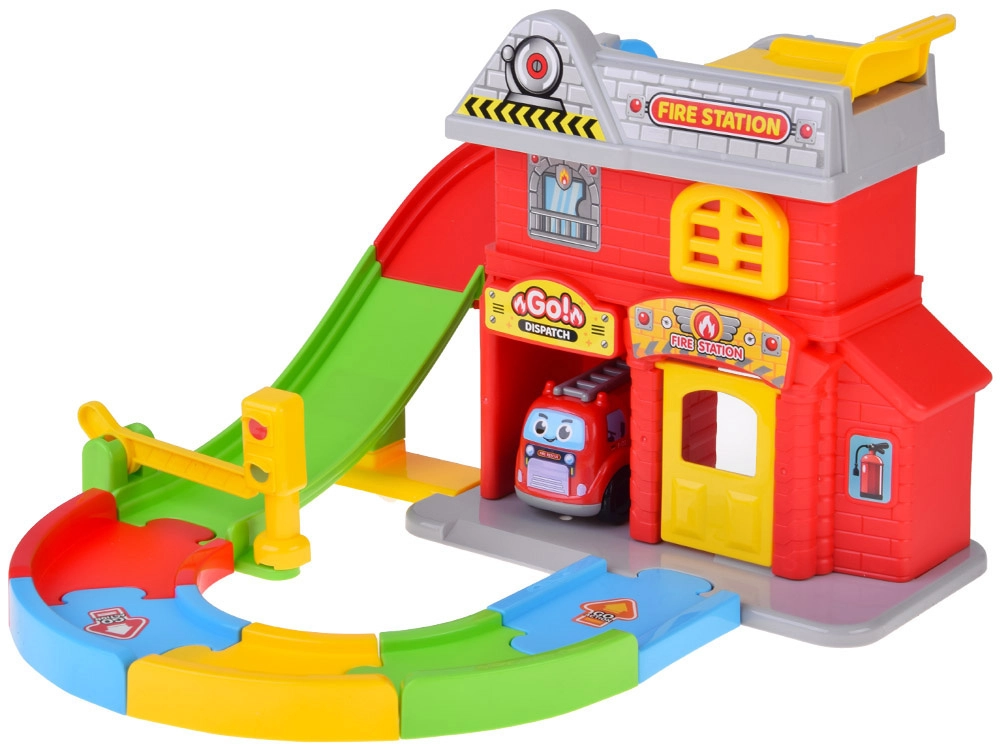 Šarena vatrogasna postaja s krivudavim/spiralnim spustom i vatrogasnim autićem donosi djeci sate zabave i razvoj vještina. Otvarajuća vrata, okidač na krovu, rampa i semafor potiču maštu, finu motoriku i razumijevanje uzroka i posljedice.