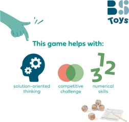 Igrači uvježbavaju računanje, prepoznavanje obrazaca i odlučivanje pri odabiru najboljih kombinacija. Čvrste drvene kocke i praktičan blok s olovkom jamče da je igra spremna za akciju – kod kuće, na vikendici i na putu.