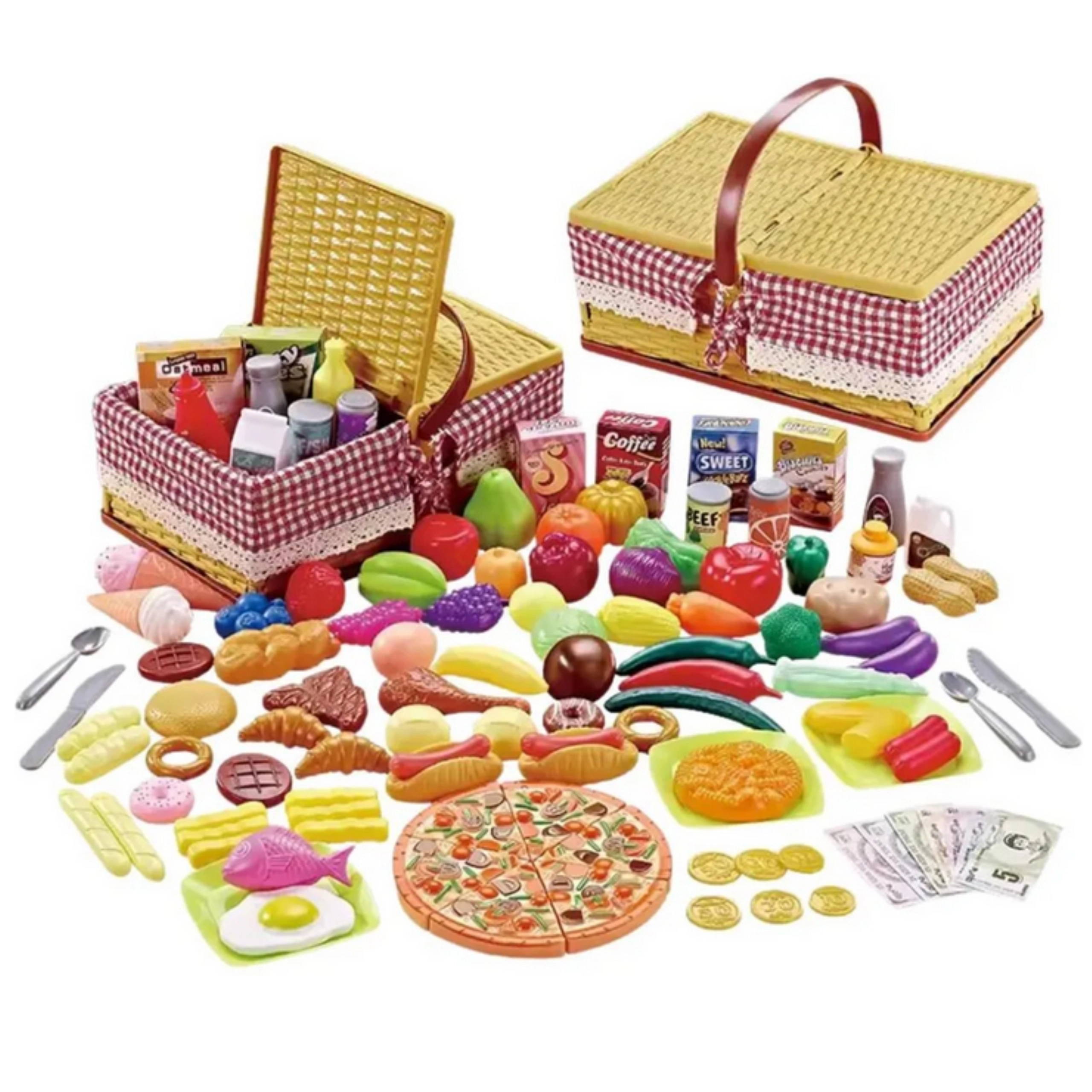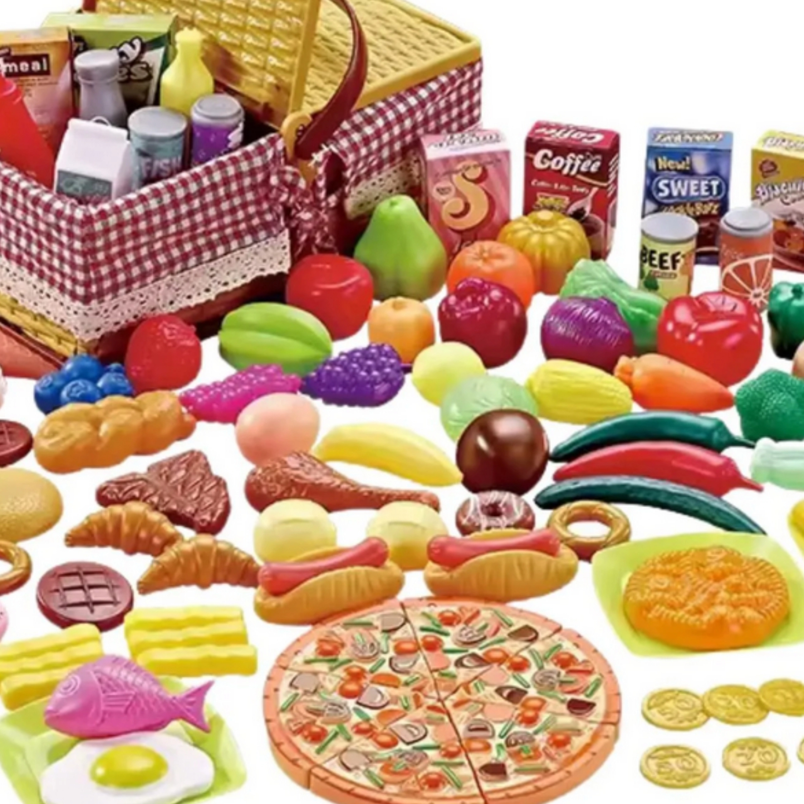 U pakiranju ćete pronaći raznolik izbor namirnica i pribora – od pizze podijeljene na komade preko voća i povrća do deserata, pića i pribora za jelo. Ne nedostaju ni novčanice i kovanice za igru trgovine, koje razvijaju logičko razmišljanje i računanje.