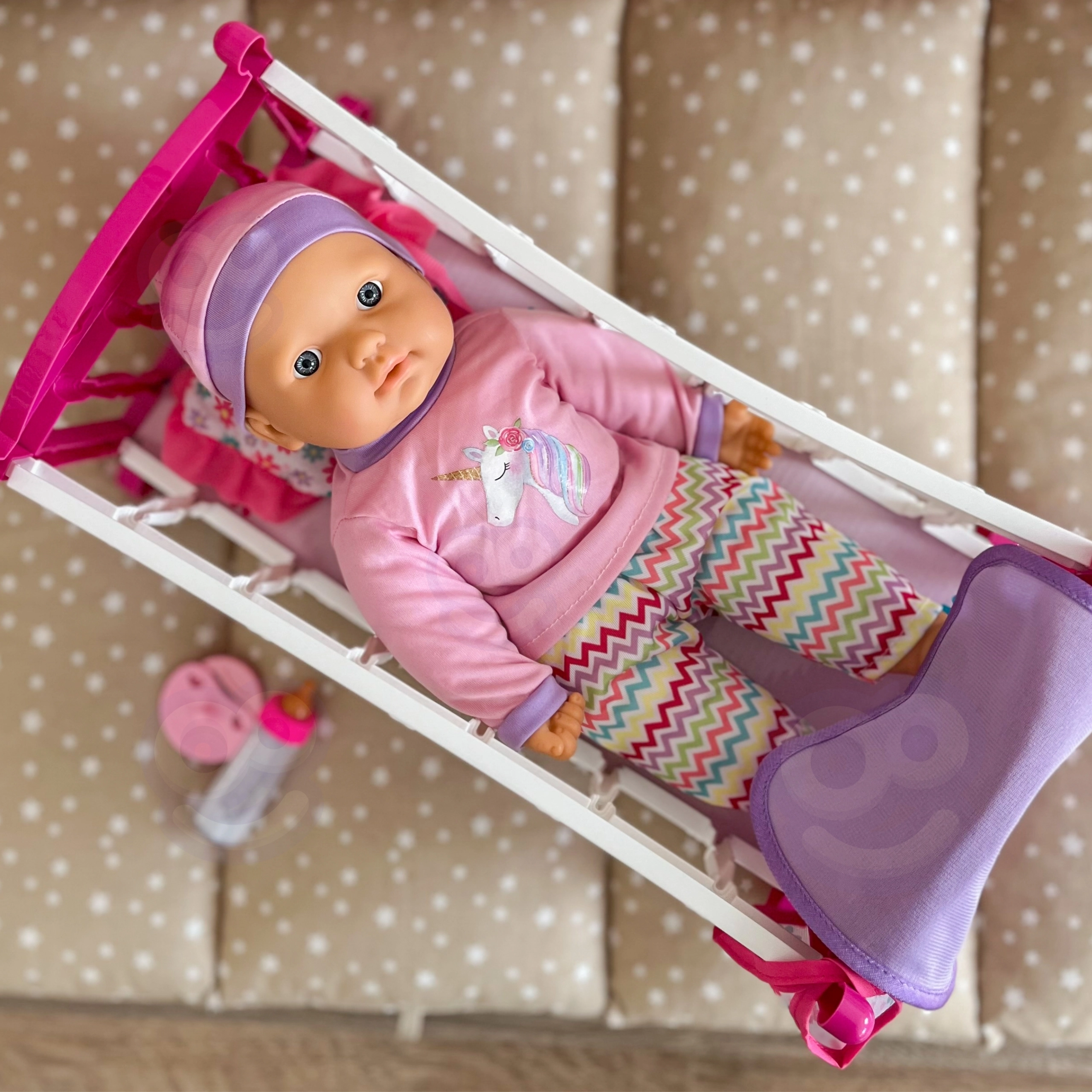 Ružičasto-bijela kolijevka s prorezanim bočnim stranicama i zakrivljenim klizačima nježno se njiše i pomaže „uljuljati” lutku na spavanje. Laka, stabilna i jednostavna za prenošenje.