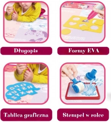 - Vodena podloga, vodeni flomasteri, šablone, žigovi, kreativni dodaci, šareni kalupčići