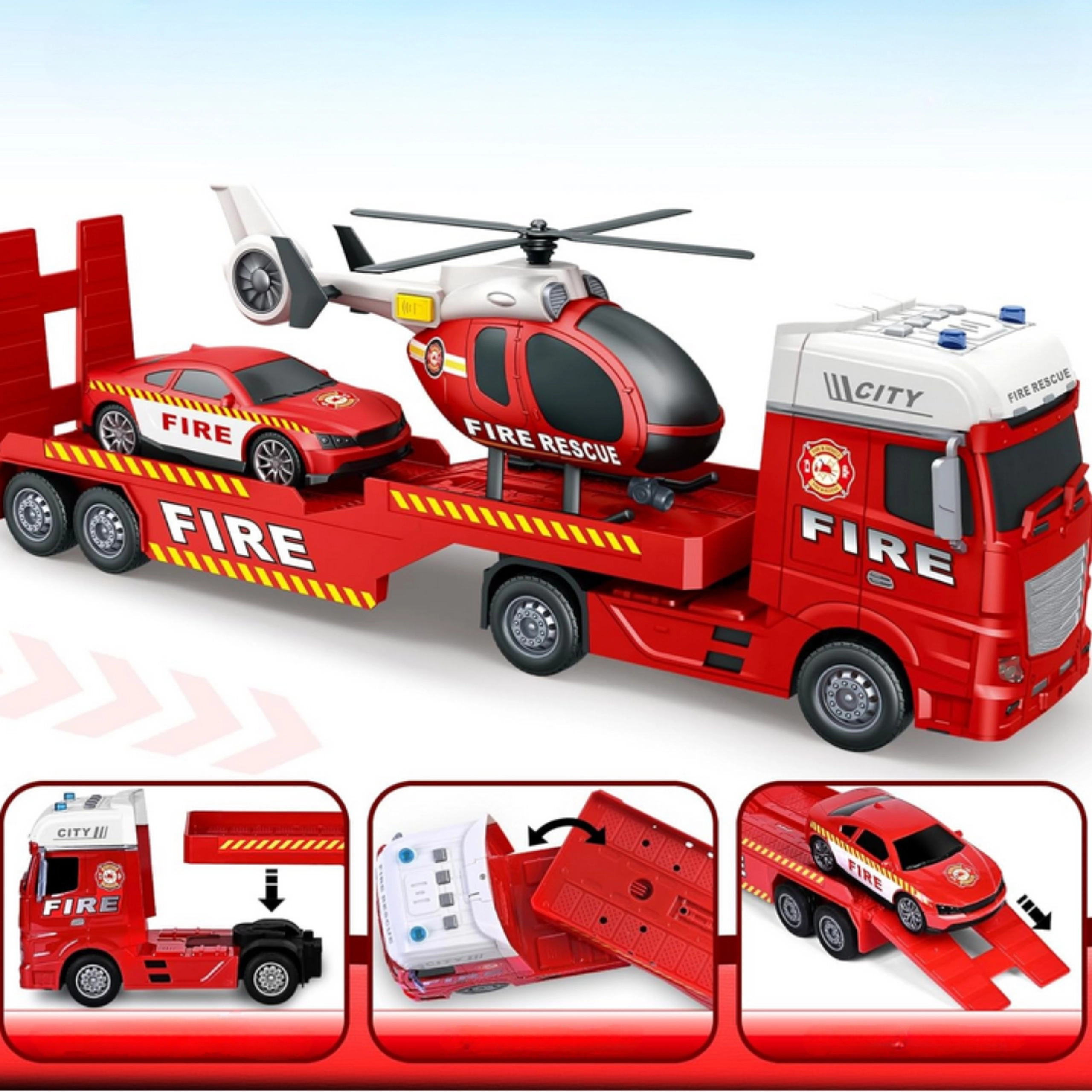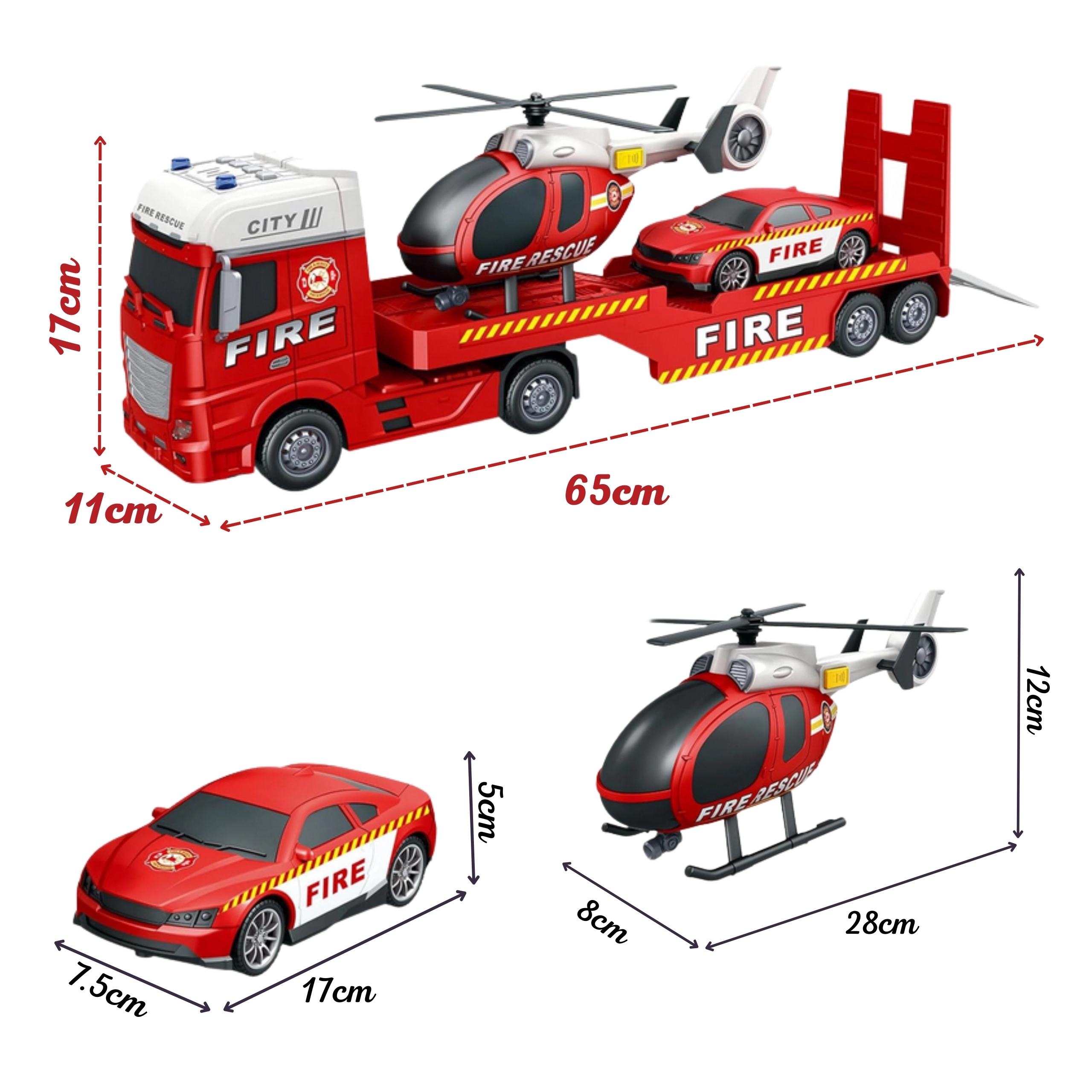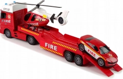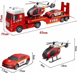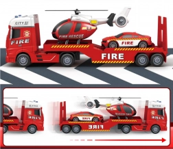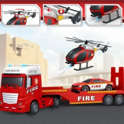 - Sadržaj pakiranja: vučni kamion s mjestom za prijevoz vozila, vatrogasni autić, helikopter s pomičnim rotorom.
