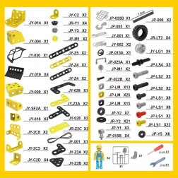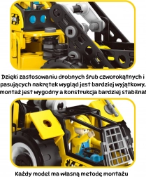- 218 konstrukcijskih elemenata, 2 figurice radnika, alati za figurice, odvijač, podesivi ključ, knjižica s montažnim uputama