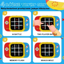 Zabavna elektronička igra za djecu od 3 godine kombinira klasični križić-kružić s modernom tehnologijom. Nudi interaktivni LCD zaslon, 4 načina igre (AI, 1v1, memory, whack‑a‑mole), fizičke igle za tradicionalno igranje i kompaktno kućište idealno za putovanja. Zvučni efekti i jednostavno upravljanje čine je odličnim izborom za cijelu obitelj.