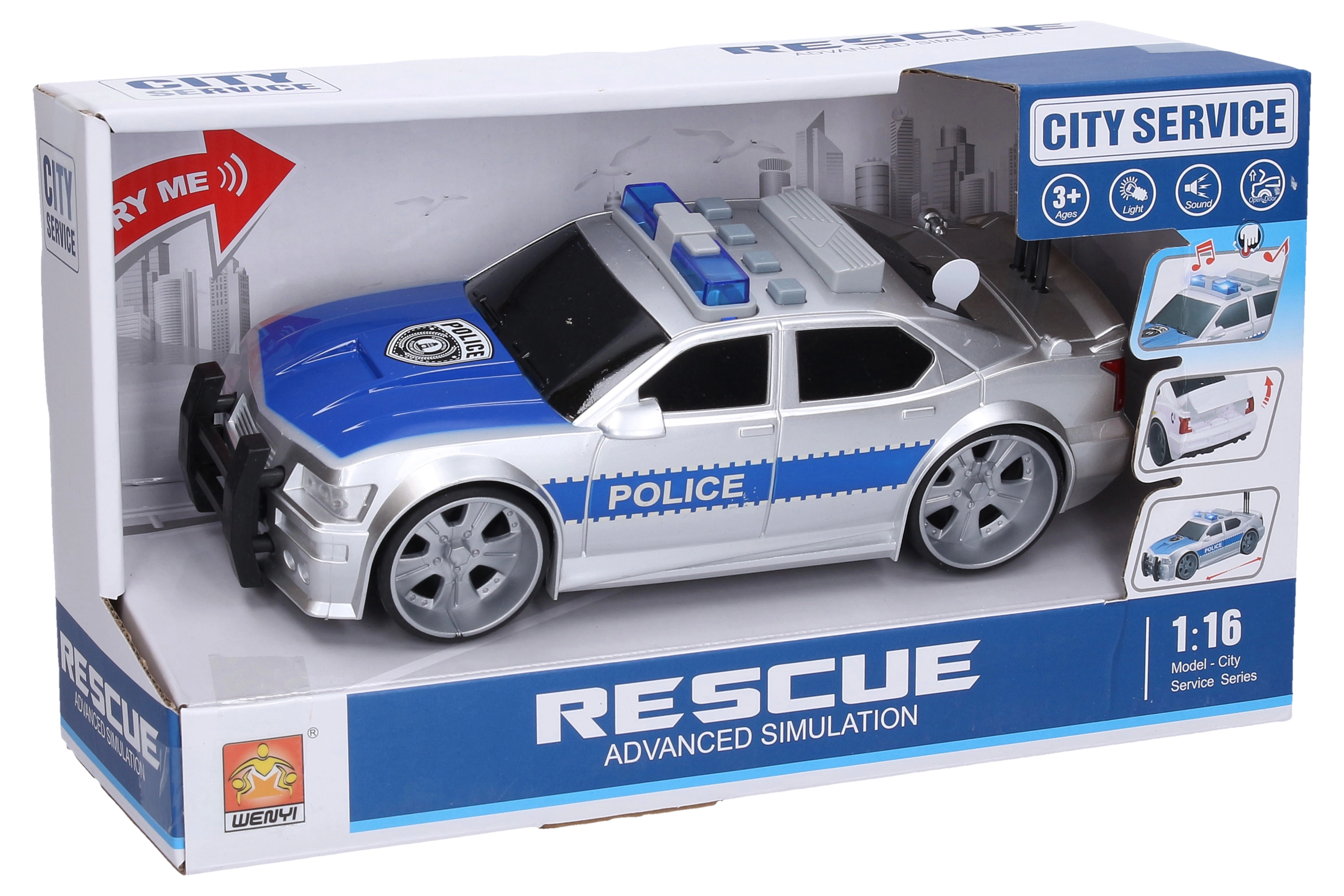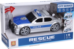 Krenite u akciju s detaljno izrađenim policijskim autom duljine 27 cm. Zahvaljujući inercijskom pogonu vozilo se lako pokreće, a realistični svjetlosni i zvučni efekti (motor, vožnja unatrag, truba, rotirka) pojačavaju svaki zadatak. Hauba se otvara jednostavnim pritiskom na gumb na krovu.