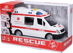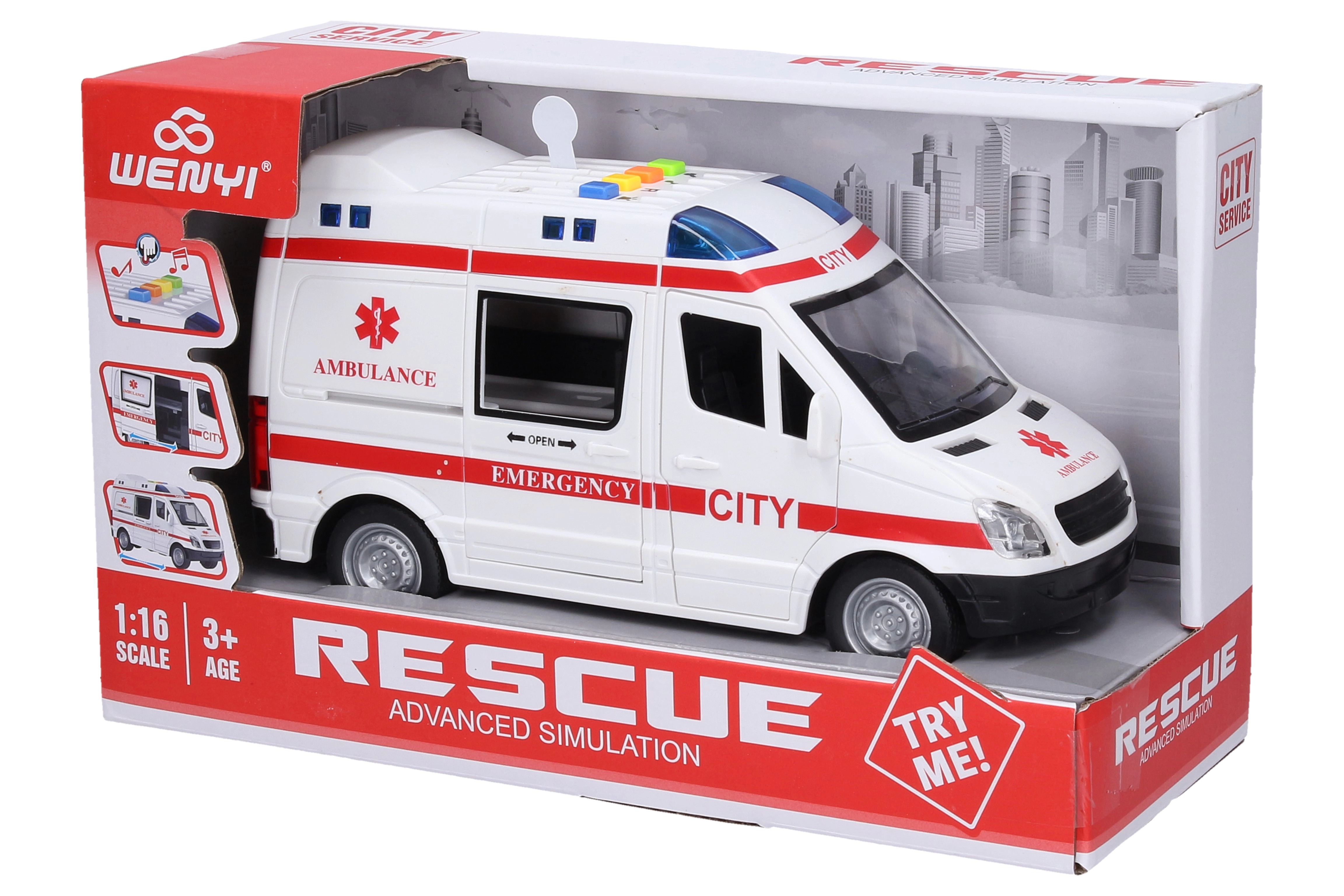 Realistična hitna pomoć na inerciju duljine 21 cm sa svjetlosnim i zvučnim efektima. Nudi otvoriva prednja i klizna stražnja vrata za još više zabave. Baterije 3× AG13 su uključene u pakiranje, pa se djeca mogu igrati odmah nakon raspakiravanja.