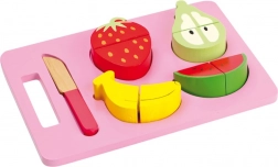 Set sadrži dasku, drveni nož i četiri vrste voća – bananu, jagodu, krušku i lubenicu. Kvalitetna drvena izrada osigurava dugotrajnost i sigurnu igru bez oštrih rubova.