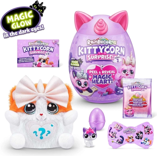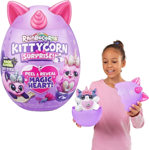 Otkrijte čarobni svijet RAINBOCORNS KITTYCORN SURPRISE – mekana plišana mačkica s jednorogovim rogom i tajnim dodacima skrivenima u jajetu. Svako pakiranje donosi radost raspakiravanja, razmjenu dodataka i kreativnu igru. Sjajan poklon za djecu od 3 godine i kolekcionarska kolekcija od 7 različitih ljubimaca.