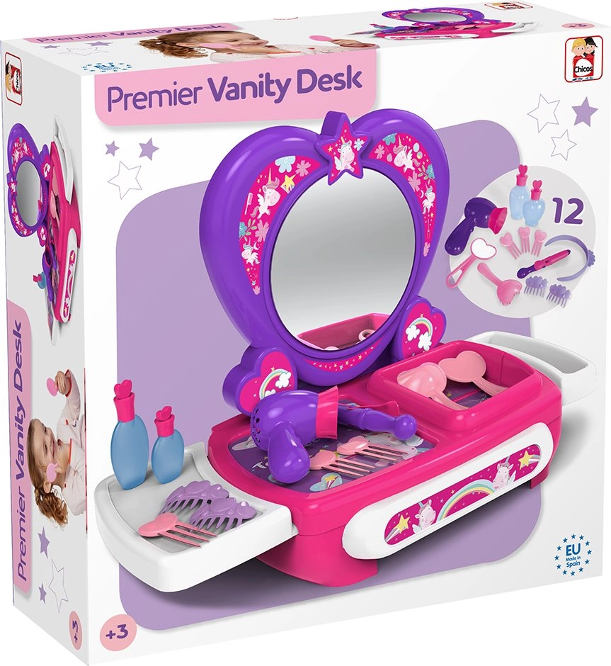 Otkrijte čaroliju igre salona s dječjim kozmetičkim stolićem Beauty Center Premier. Set nudi veliko zrcalo u obliku srca, praktične odjeljke za pohranu i 12 dodataka za beskrajne sate kreativne zabave – od sušila za kosu preko češljeva do bočica “parfema” i ukosnica.