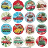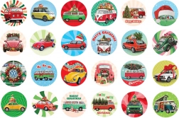 Kolekcija ilustriranih scena s VW automobilima i kombijima, darovima i božićnim drvcima stvara dekorativan kolaž pun blagdanske atmosfere.