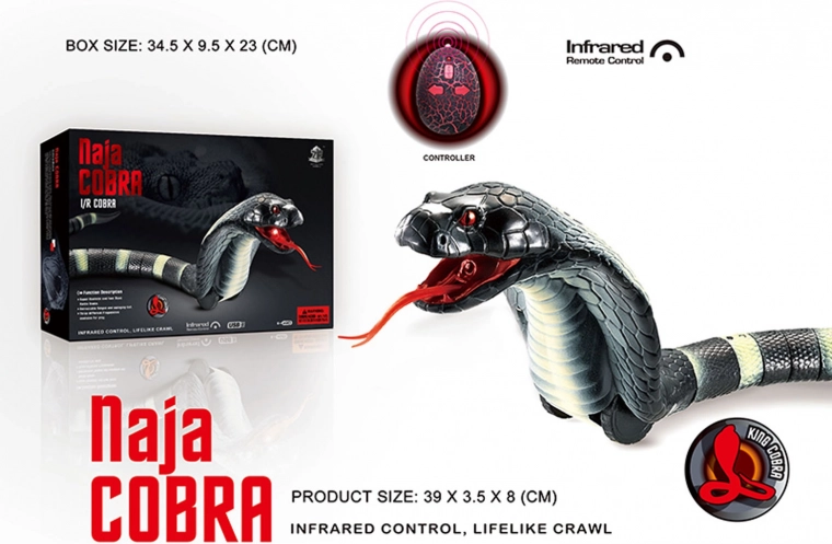 Realistična RC kobra za djecu od 6 godina oduševit će prirodnim kretanjem i efektima. Kreće se u tri smjera (naprijed, desno, lijevo), gmiže kao prava zmija, isplazuje jezik i ima osvijetljenu čeljust. Rep od 21 segmenta osigurava glatko i brzo kretanje. Upravljanje na frekvenciji 2,4 GHz pomoću daljinskog upravljača u obliku jajeta. Punjiva baterija 3,7 V je uključena u pakiranje, kao i baterije za upravljač.