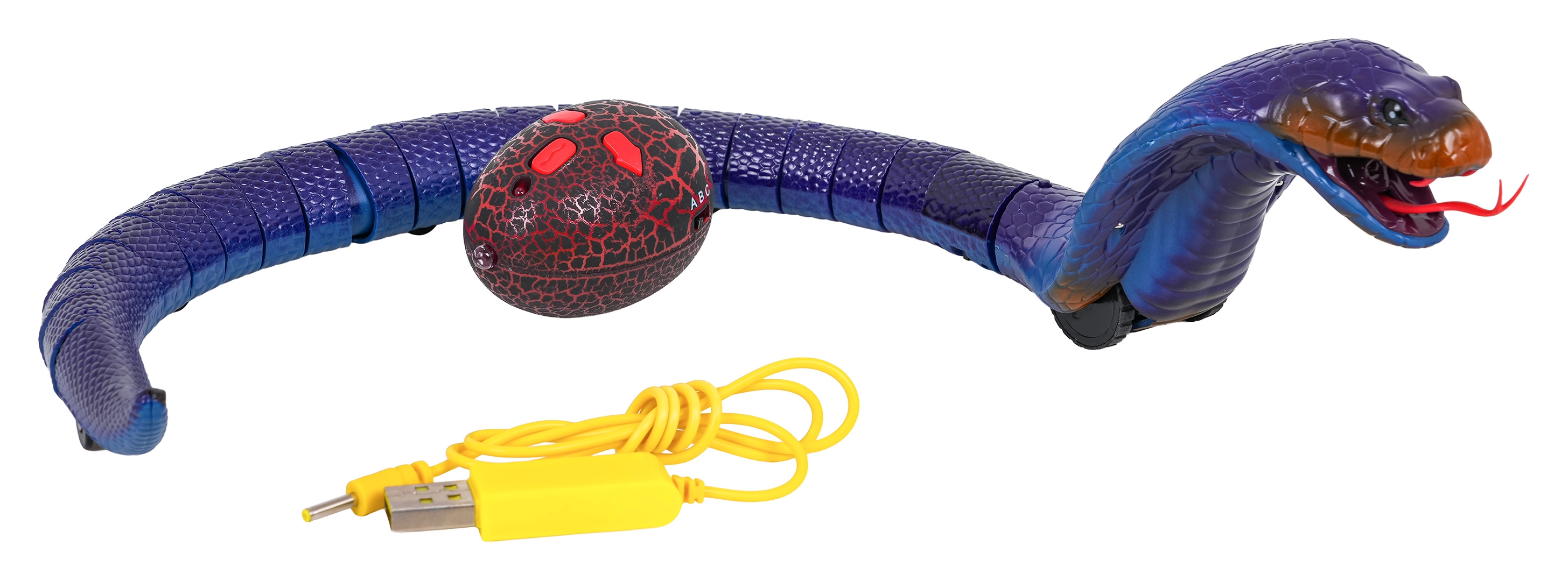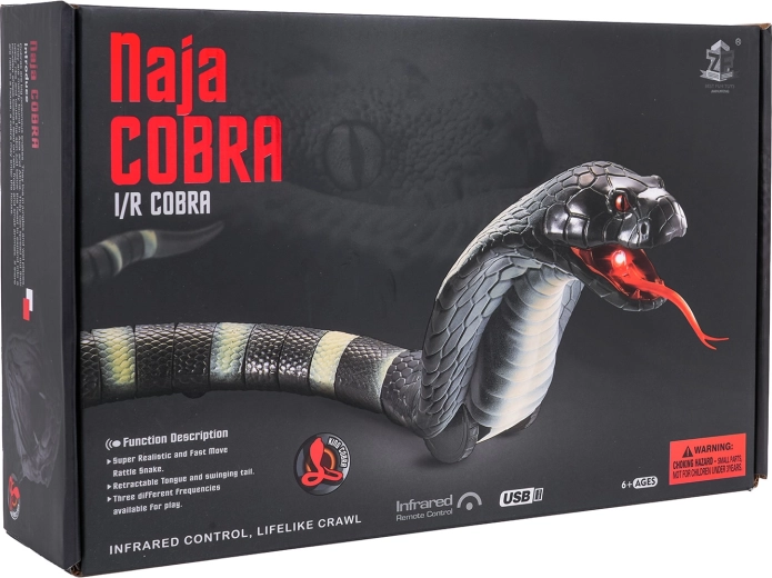 RC kobra je efektna igračka koja impresionira realističnim izgledom i kretanjem. Segmentirani rep (21 dio) osigurava glatko „valovito“ gibanje i brze manevre, dok pokretni jezik i LED svjetlo u čeljusti daju igri dramatičan dojam. Upravljanje na frekvenciji 2,4 GHz stabilno je i jednostavno čak i za djecu.