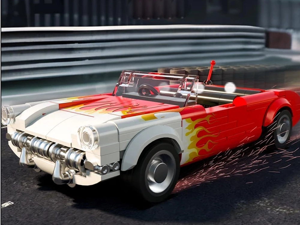 Crveno-bijeli roadster s plamenovima, otvorenim kokpitom i detaljnom maskom donosi atmosferu klasičnih američkih vozila 50-ih.